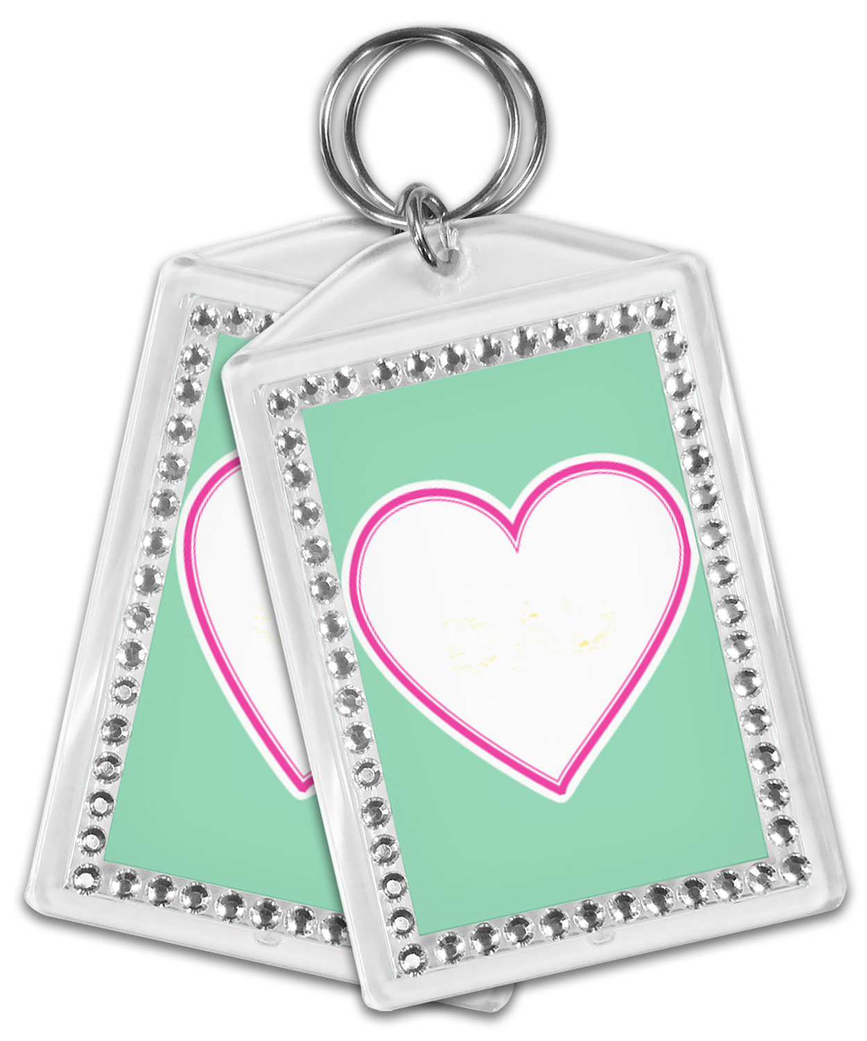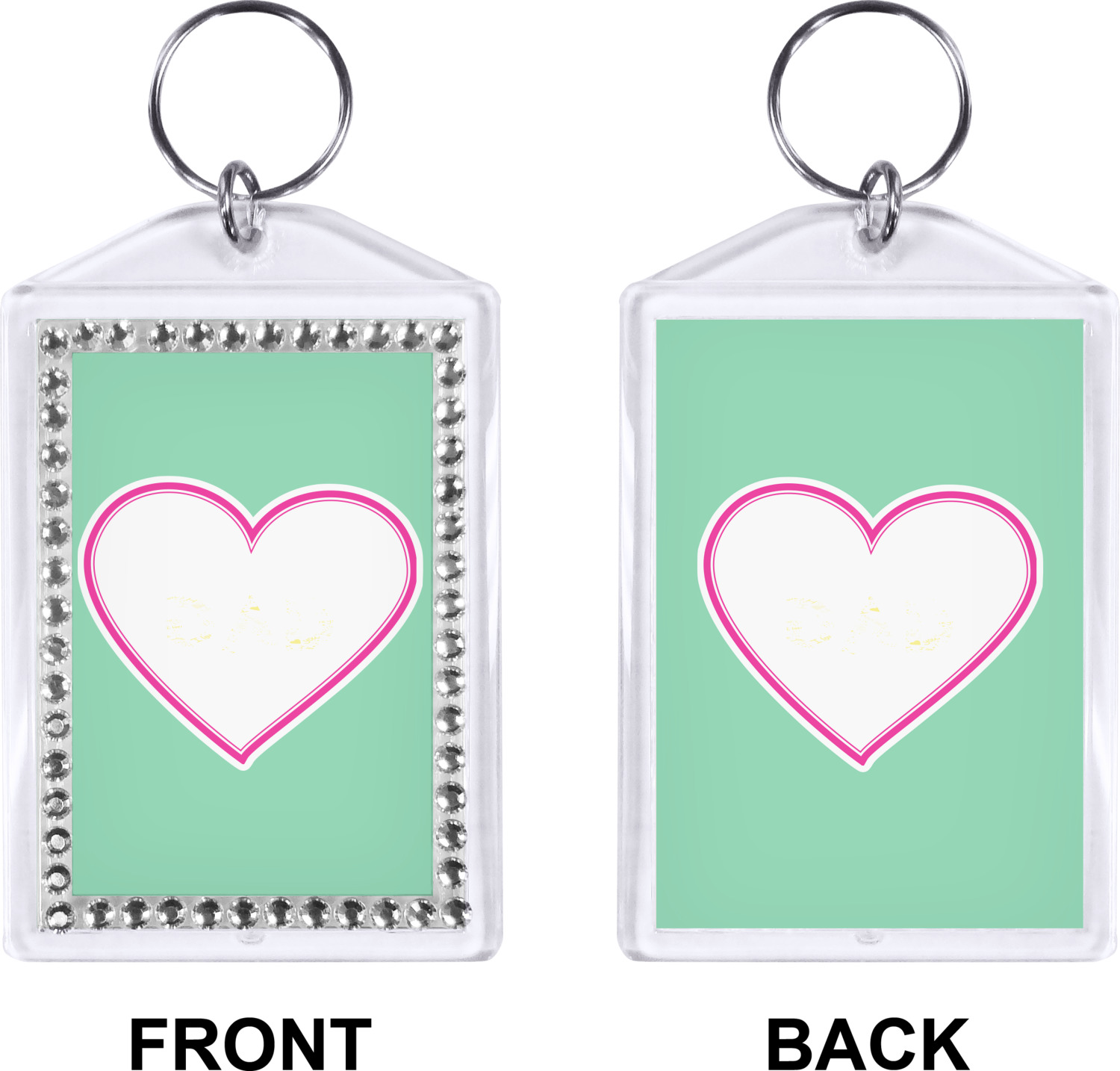 Our personalized keychains have a bold, rectangular shape, outlined by a series of shimmering rhinestones. A metal, split keyring is included with your purchase, and an additional metal hoop allows for attachment of the keychain to the split ring. This unique keychain measures at about 3.75 by 2.5 inches. We print your customized design(s) across both the back and front of this keychain.