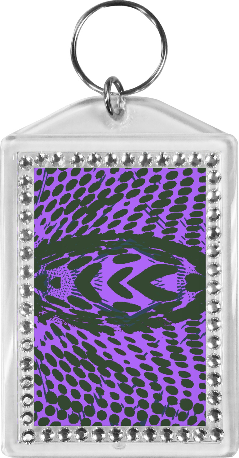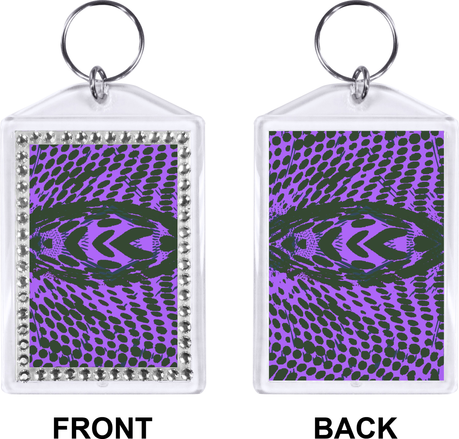 Our personalized keychains have a bold, rectangular shape, outlined by a series of shimmering rhinestones. A metal, split keyring is included with your purchase, and an additional metal hoop allows for attachment of the keychain to the split ring. This unique keychain measures at about 3.75 by 2.5 inches. We print your customized design(s) across both the back and front of this keychain.