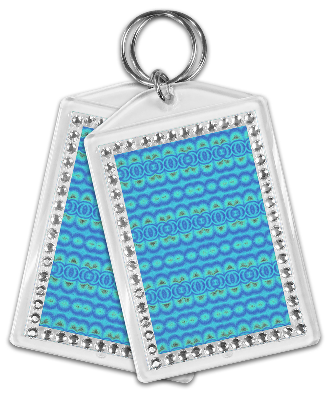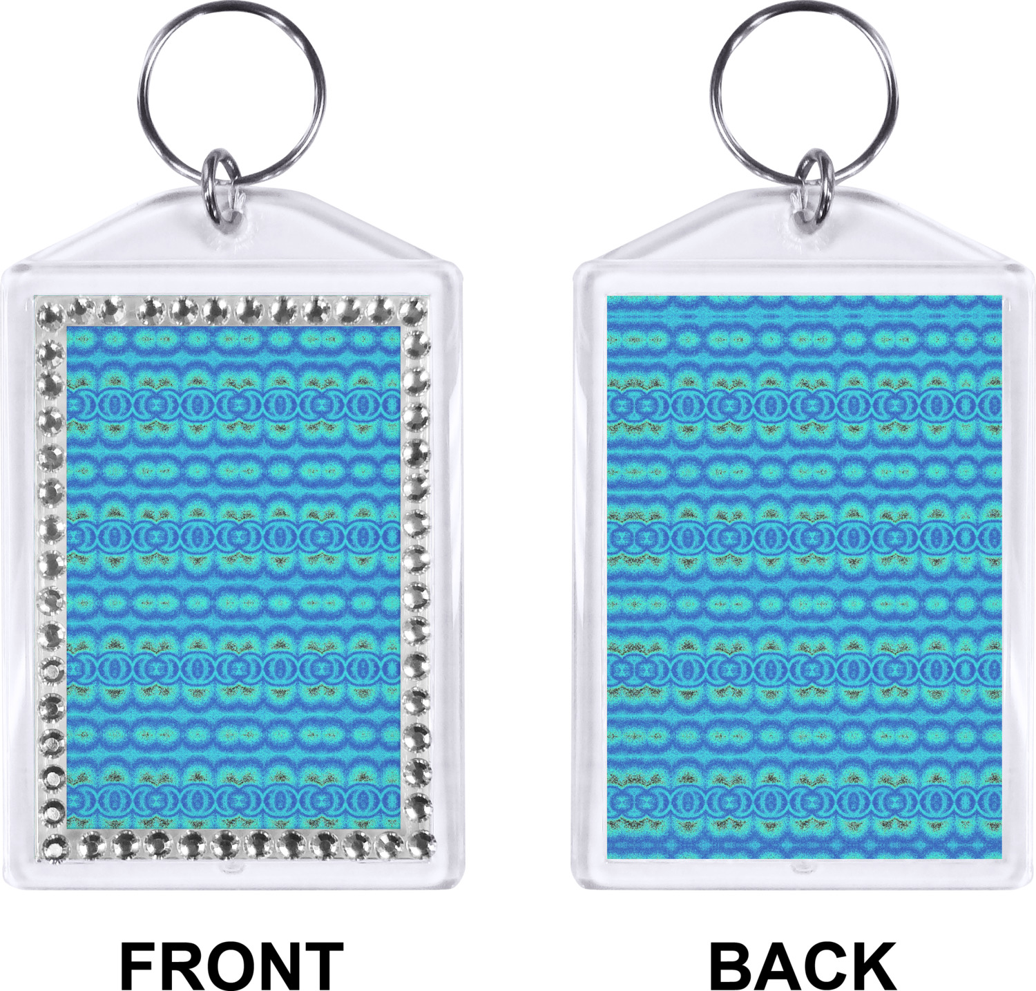 Our personalized keychains have a bold, rectangular shape, outlined by a series of shimmering rhinestones. A metal, split keyring is included with your purchase, and an additional metal hoop allows for attachment of the keychain to the split ring. This unique keychain measures at about 3.75 by 2.5 inches. We print your customized design(s) across both the back and front of this keychain.