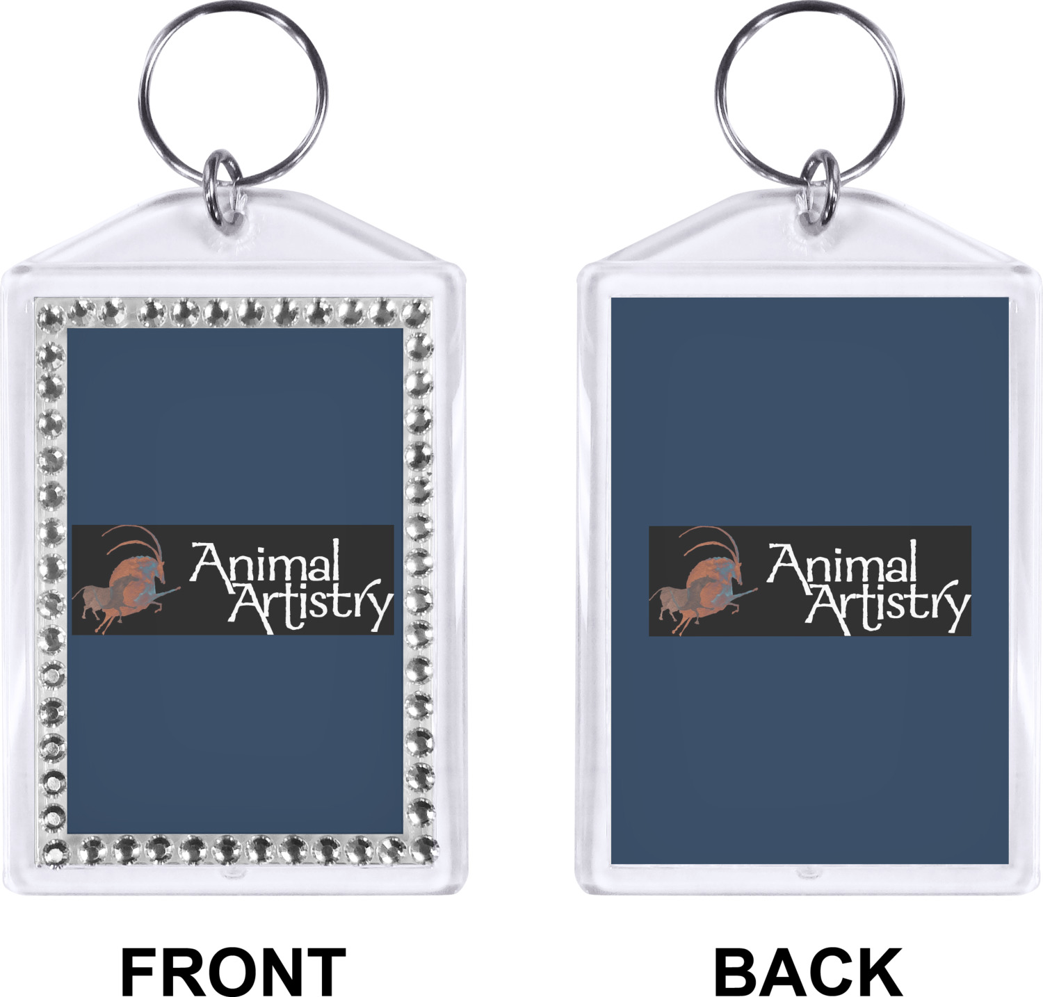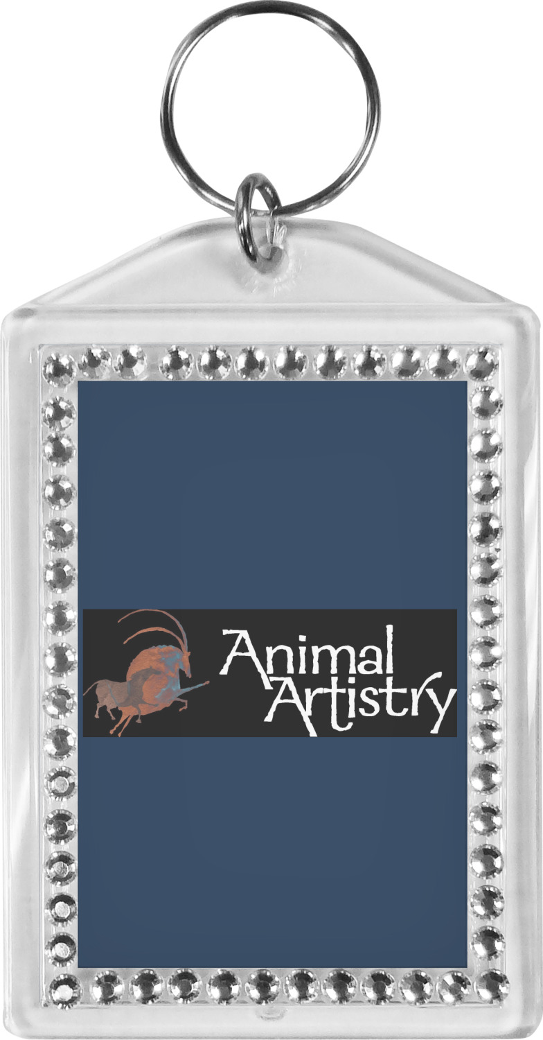 Our personalized keychains have a bold, rectangular shape, outlined by a series of shimmering rhinestones. A metal, split keyring is included with your purchase, and an additional metal hoop allows for attachment of the keychain to the split ring. This unique keychain measures at about 3.75 by 2.5 inches. We print your customized design(s) across both the back and front of this keychain.