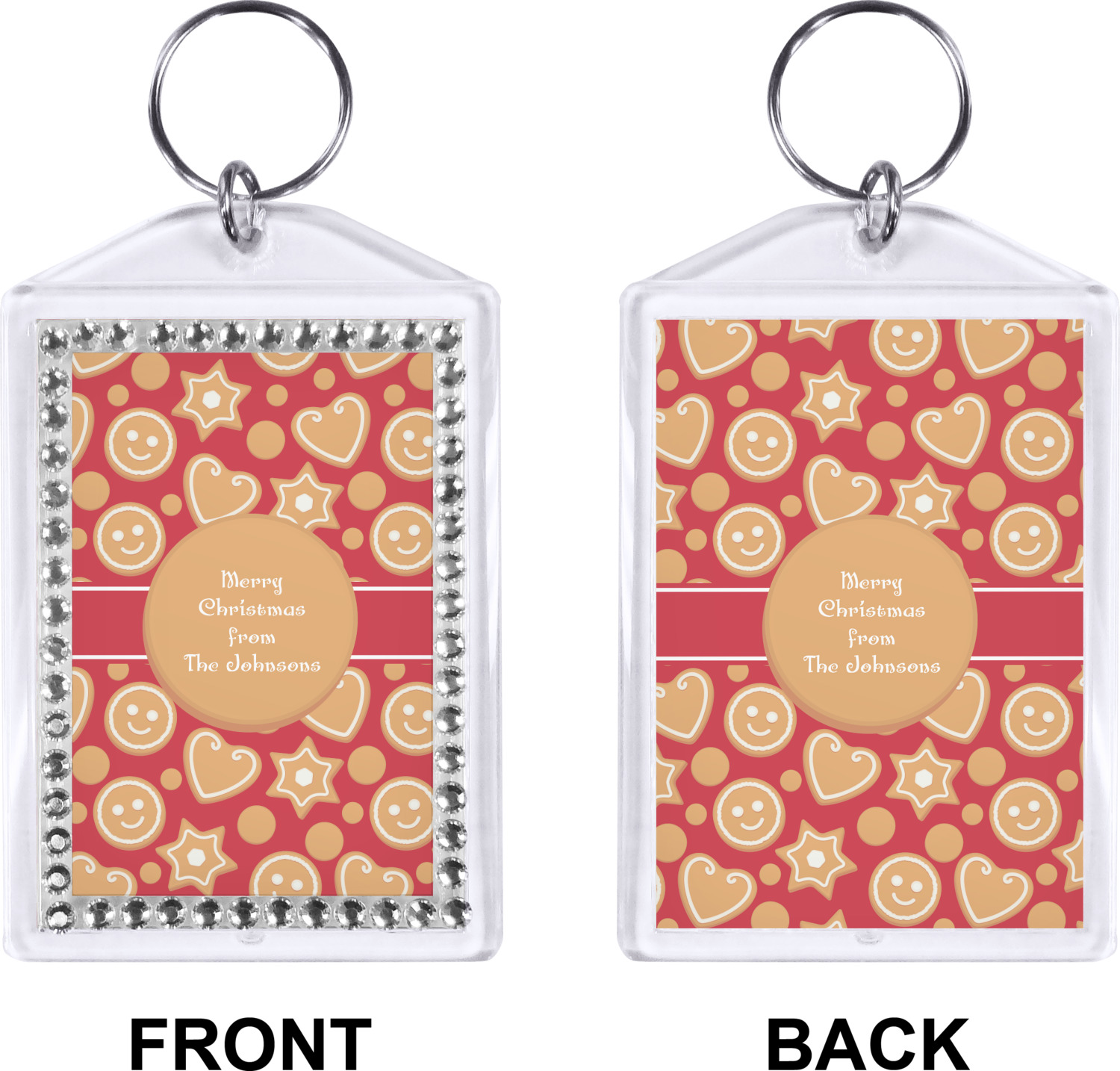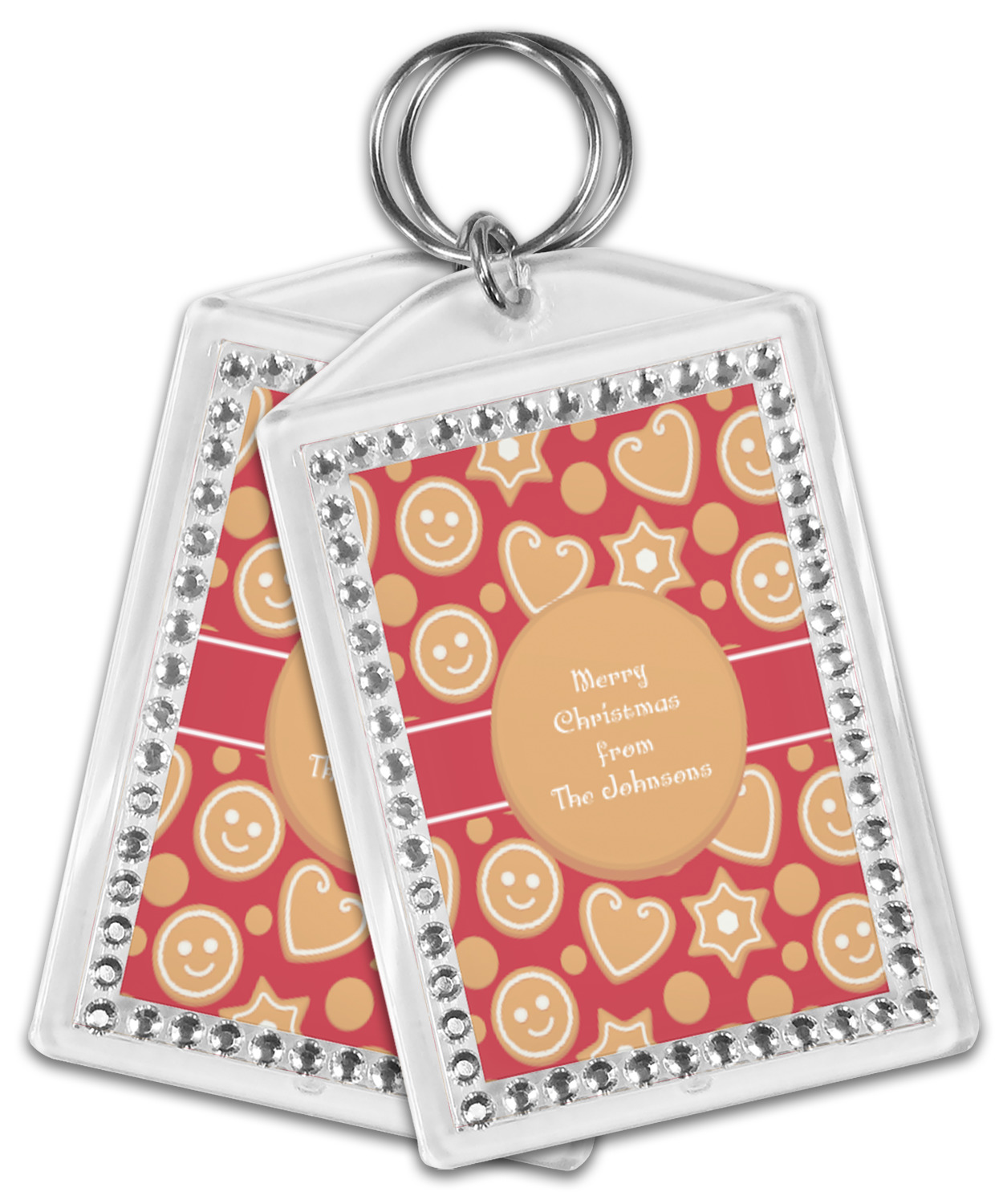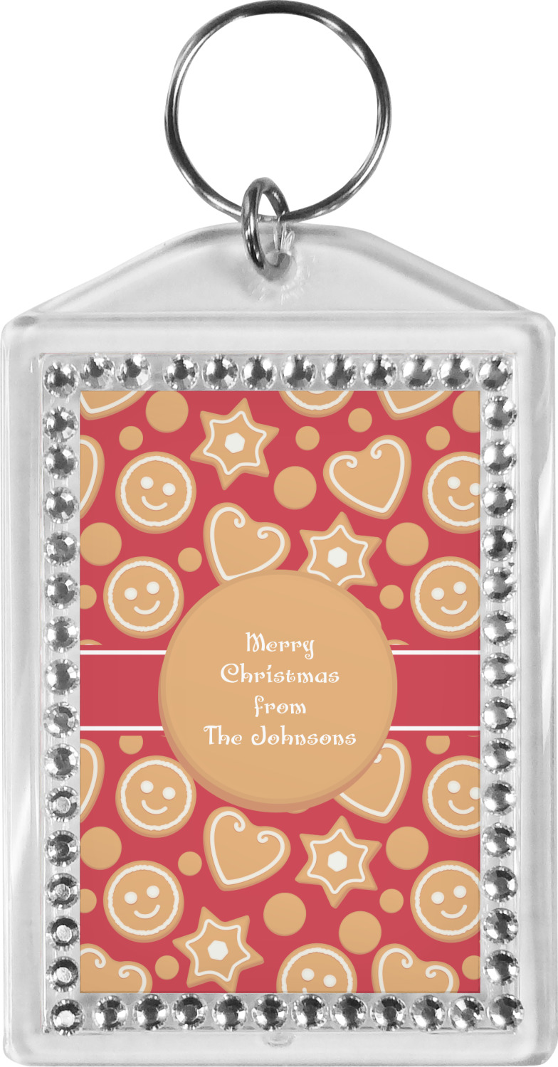 Our personalized keychains have a bold, rectangular shape, outlined by a series of shimmering rhinestones. A metal, split keyring is included with your purchase, and an additional metal hoop allows for attachment of the keychain to the split ring. This unique keychain measures at about 3.75 by 2.5 inches. We print your customized design(s) across both the back and front of this keychain.