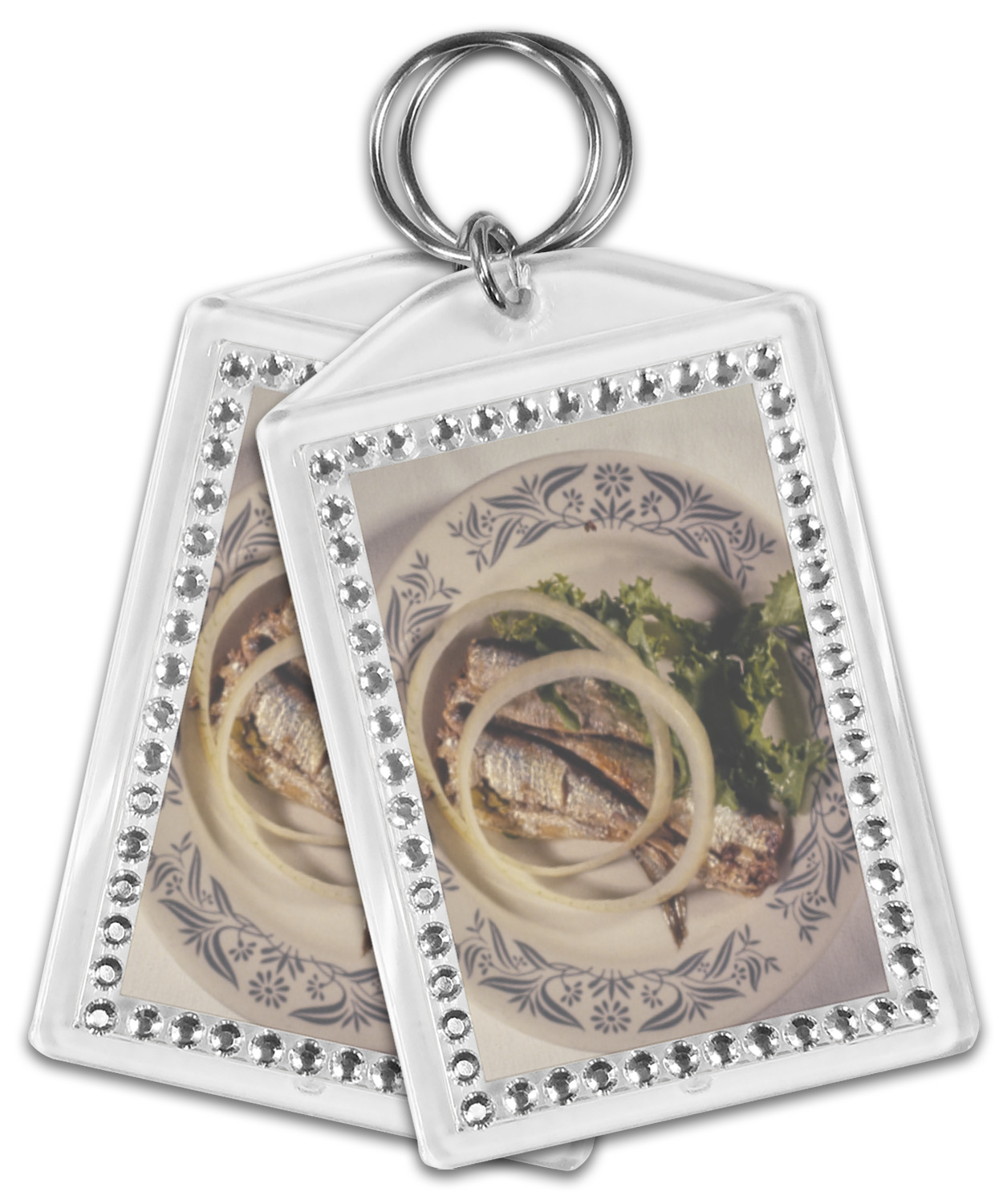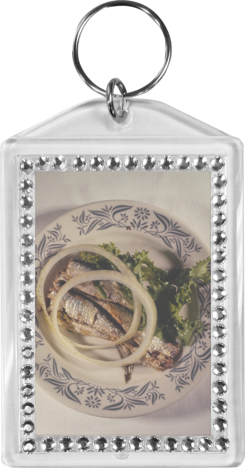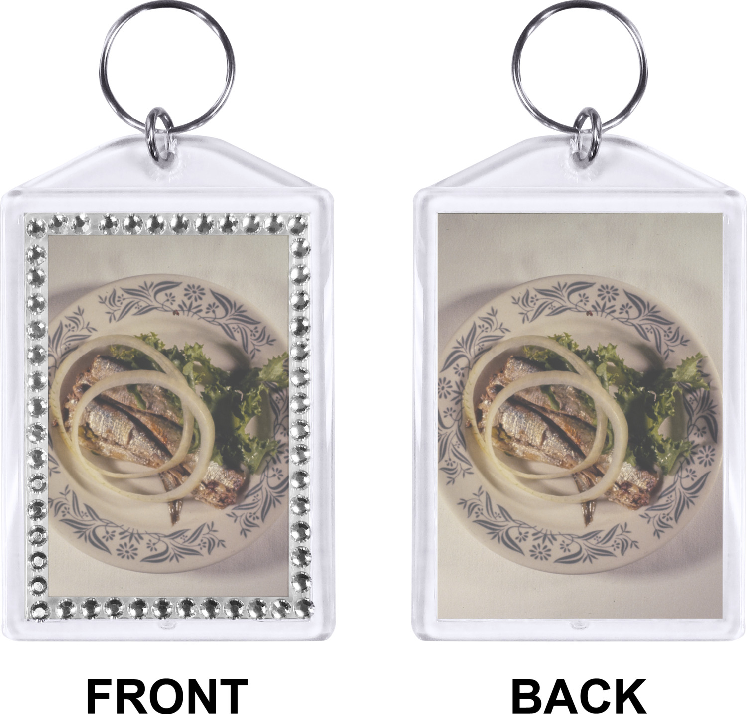 Our personalized keychains have a bold, rectangular shape, outlined by a series of shimmering rhinestones. A metal, split keyring is included with your purchase, and an additional metal hoop allows for attachment of the keychain to the split ring. This unique keychain measures at about 3.75 by 2.5 inches. We print your customized design(s) across both the back and front of this keychain.