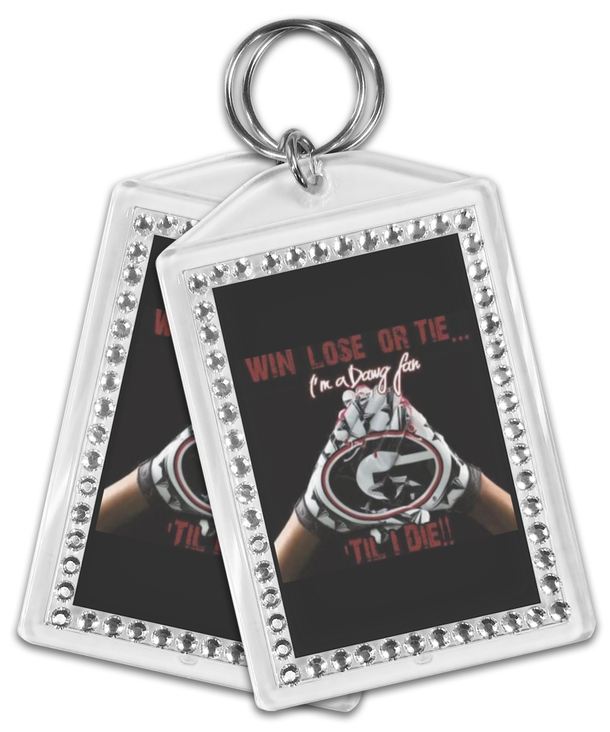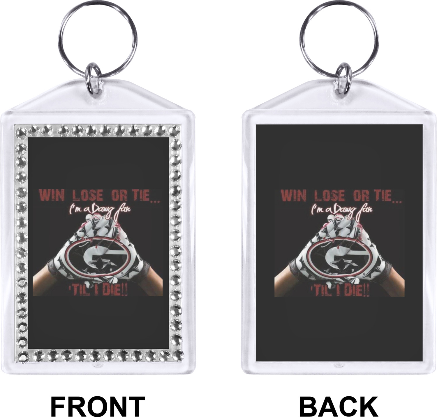 Our personalized keychains have a bold, rectangular shape, outlined by a series of shimmering rhinestones. A metal, split keyring is included with your purchase, and an additional metal hoop allows for attachment of the keychain to the split ring. This unique keychain measures at about 3.75 by 2.5 inches. We print your customized design(s) across both the back and front of this keychain.
