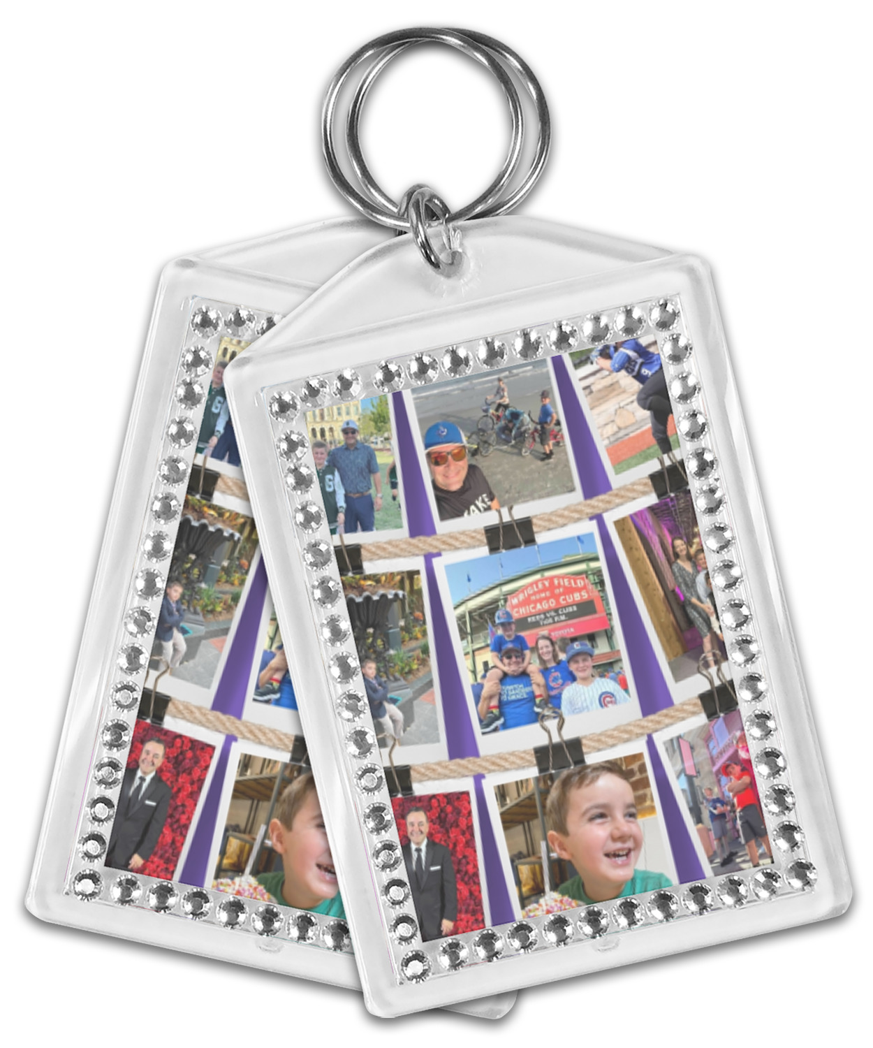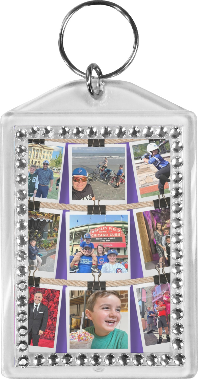 Our personalized keychains have a bold, rectangular shape, outlined by a series of shimmering rhinestones. A metal, split keyring is included with your purchase, and an additional metal hoop allows for attachment of the keychain to the split ring. This unique keychain measures at about 3.75 by 2.5 inches. We print your customized design(s) across both the back and front of this keychain.