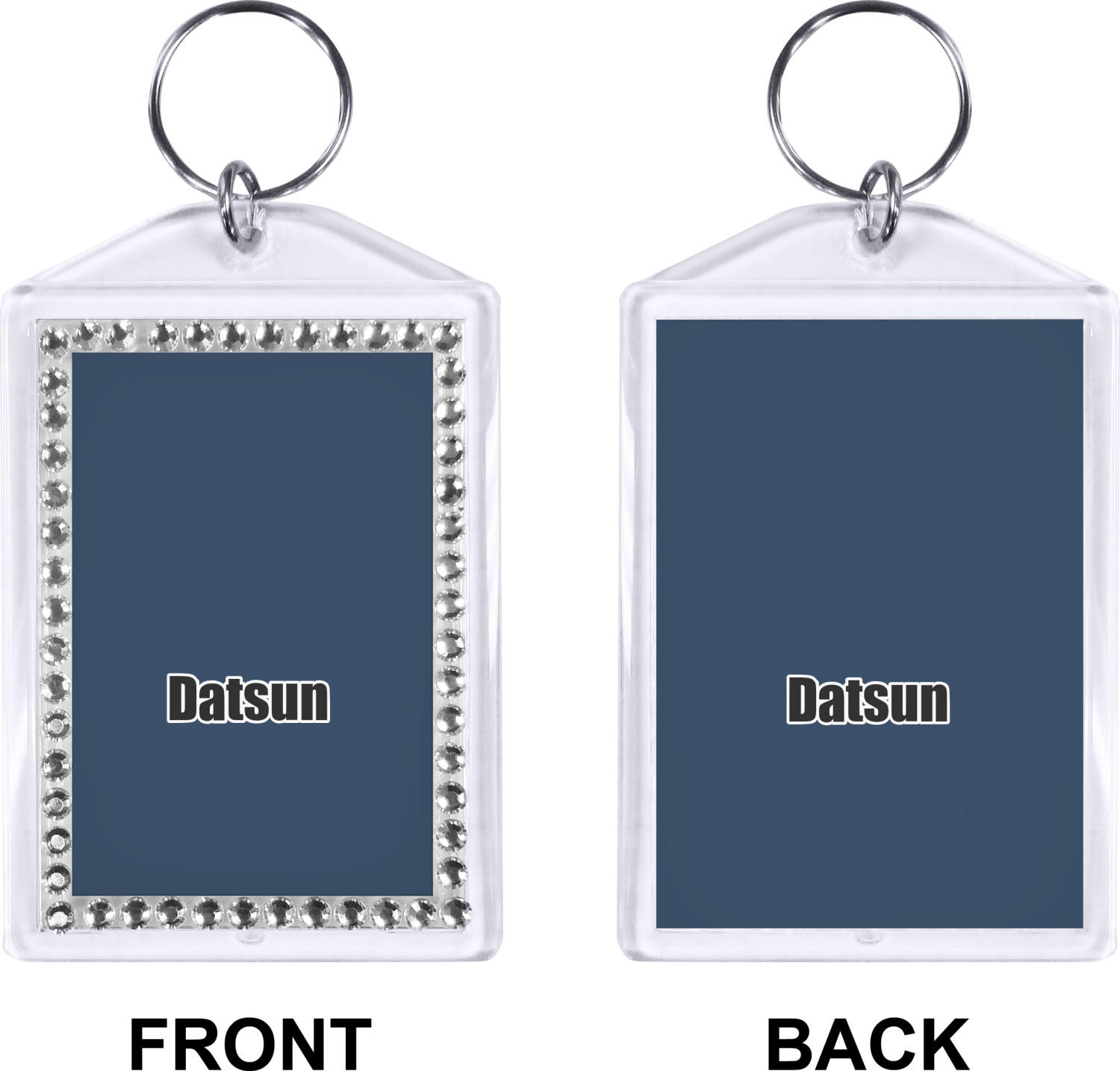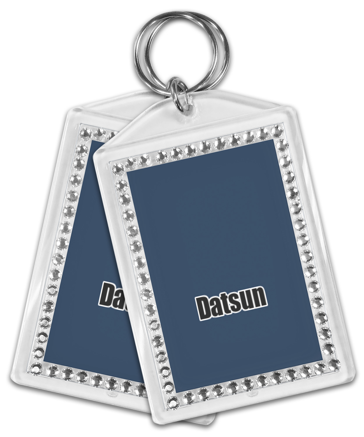 Our personalized keychains have a bold, rectangular shape, outlined by a series of shimmering rhinestones. A metal, split keyring is included with your purchase, and an additional metal hoop allows for attachment of the keychain to the split ring. This unique keychain measures at about 3.75 by 2.5 inches. We print your customized design(s) across both the back and front of this keychain.