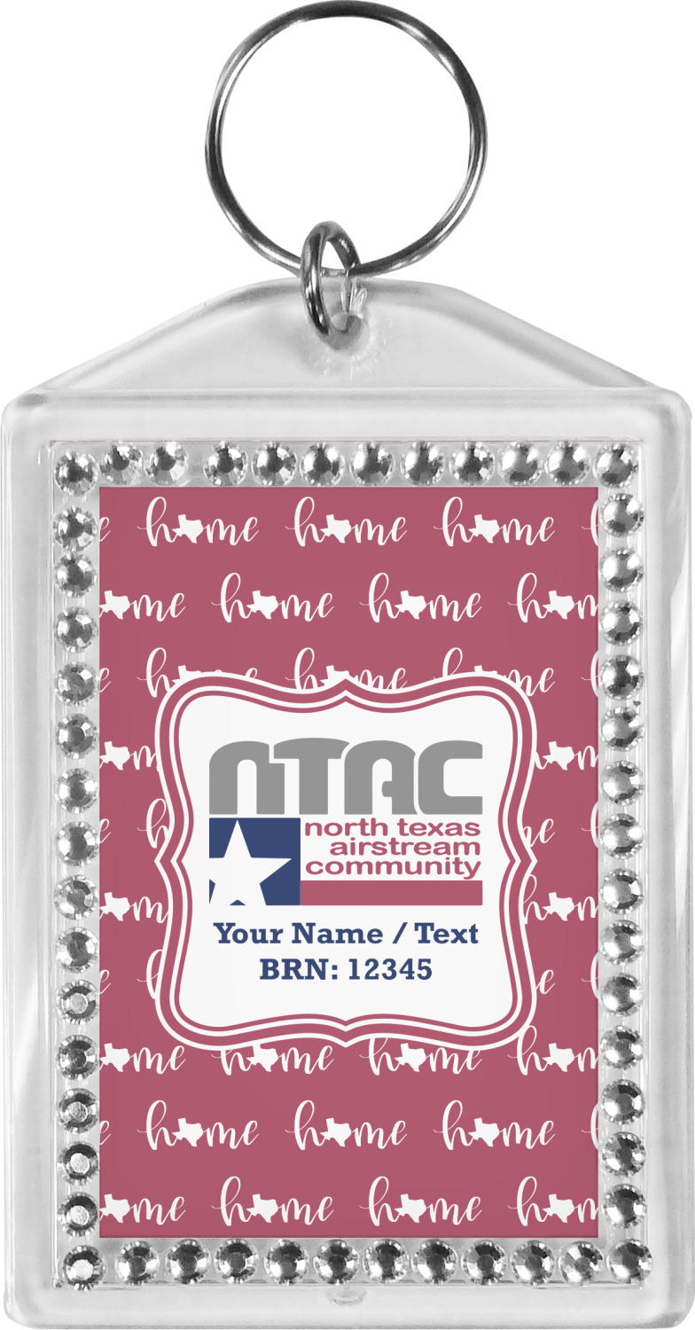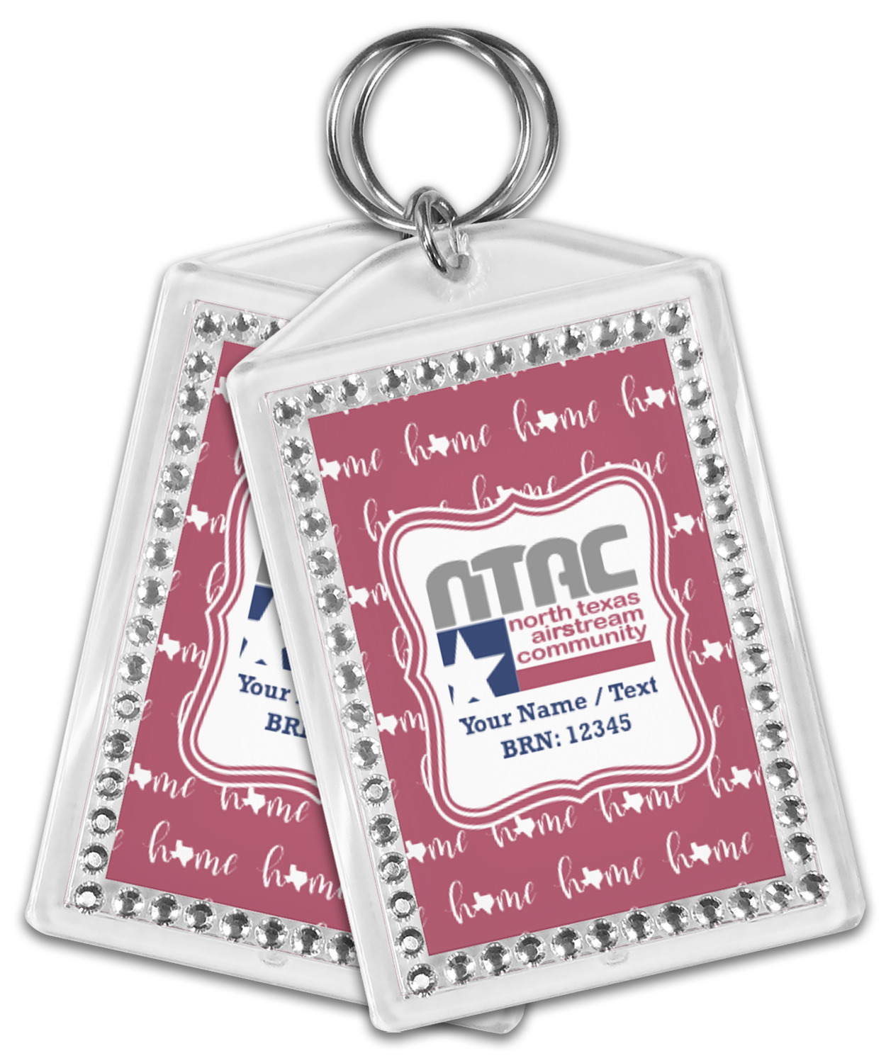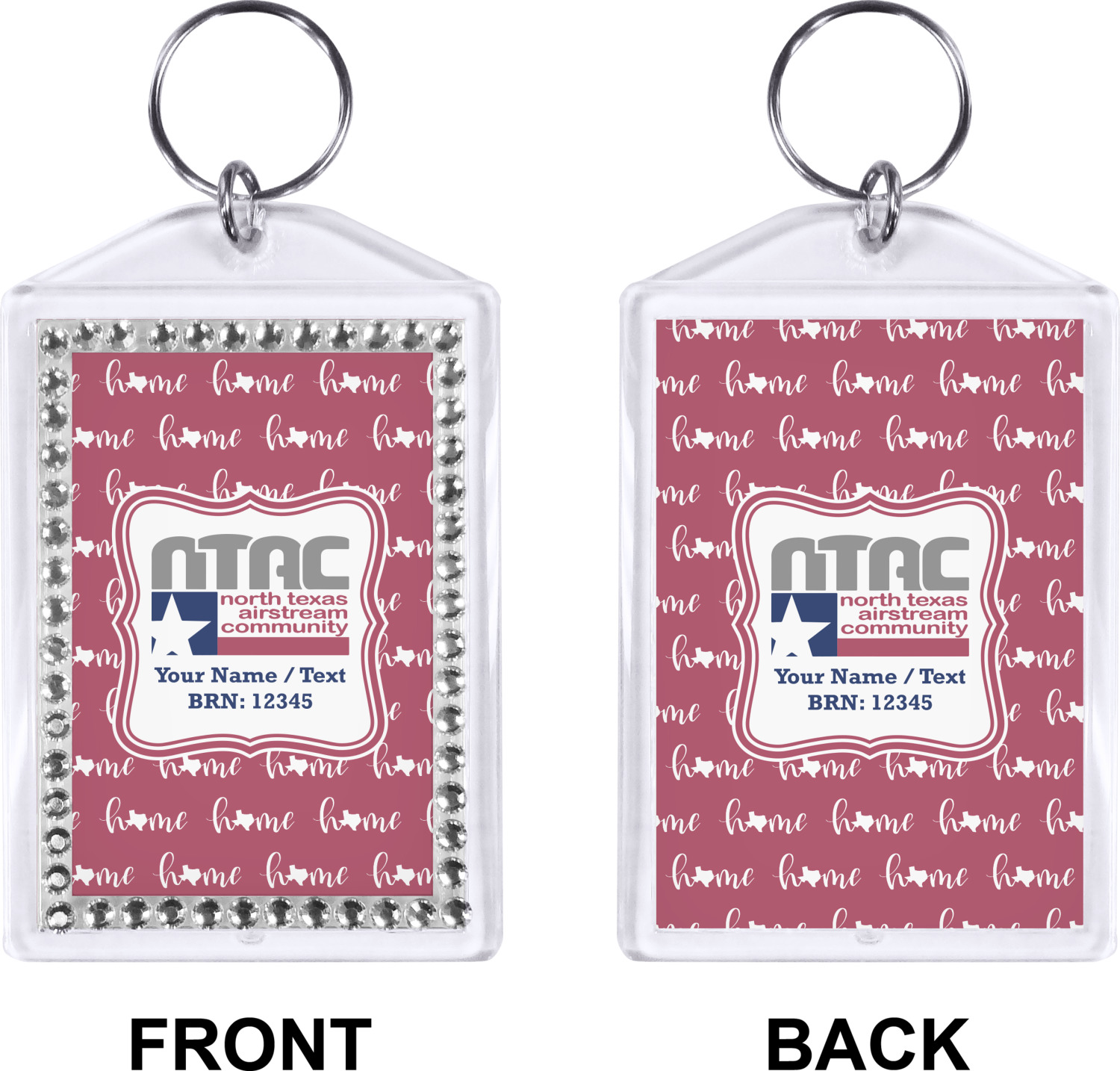 Our personalized keychains have a bold, rectangular shape, outlined by a series of shimmering rhinestones. A metal, split keyring is included with your purchase, and an additional metal hoop allows for attachment of the keychain to the split ring. This unique keychain measures at about 3.75 by 2.5 inches. We print your customized design(s) across both the back and front of this keychain.