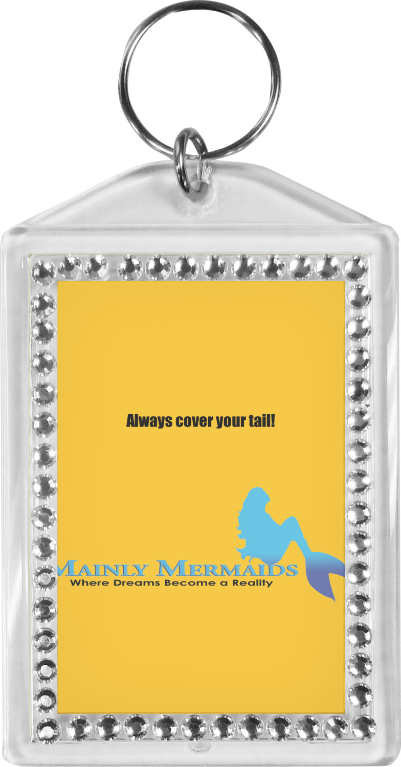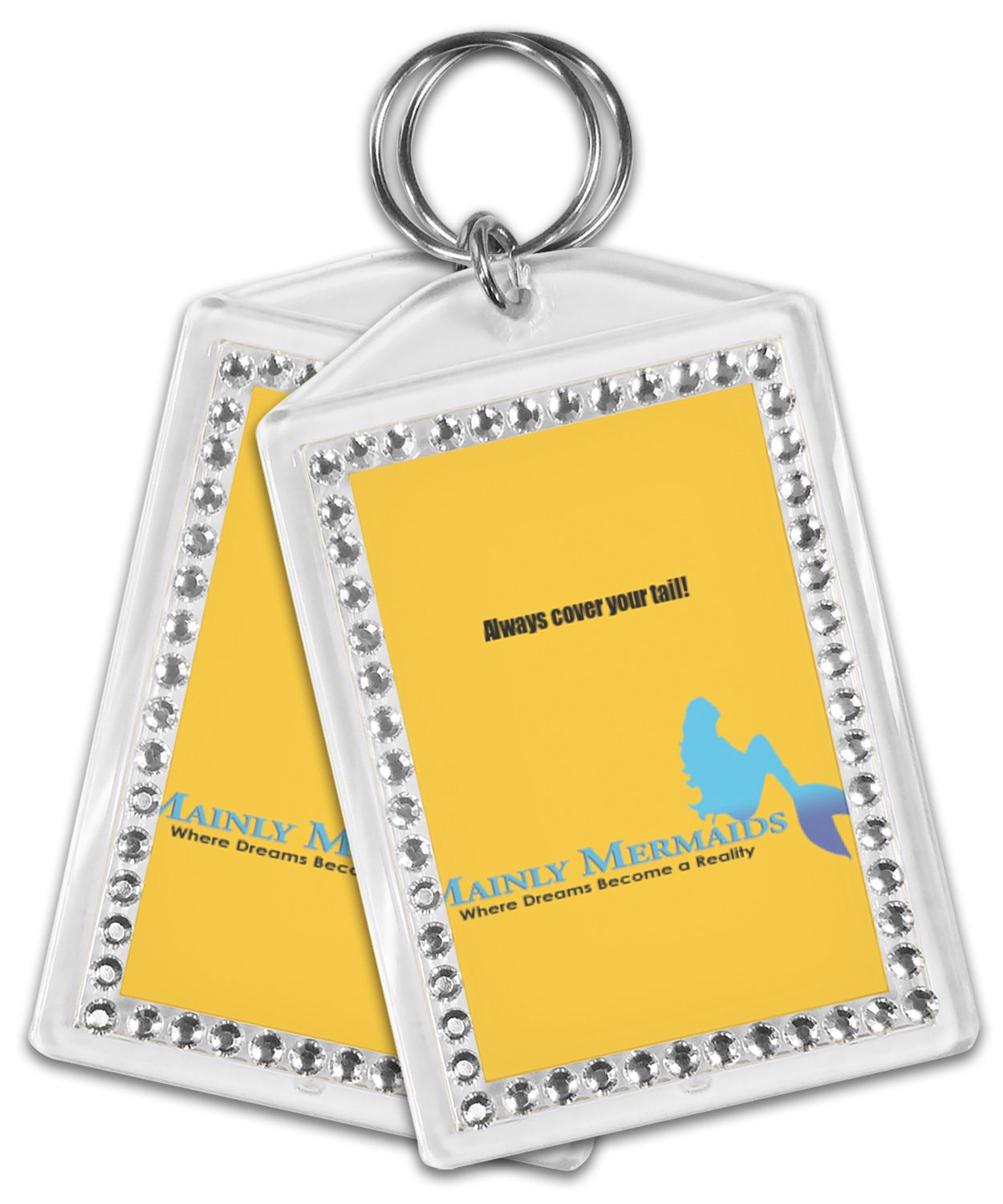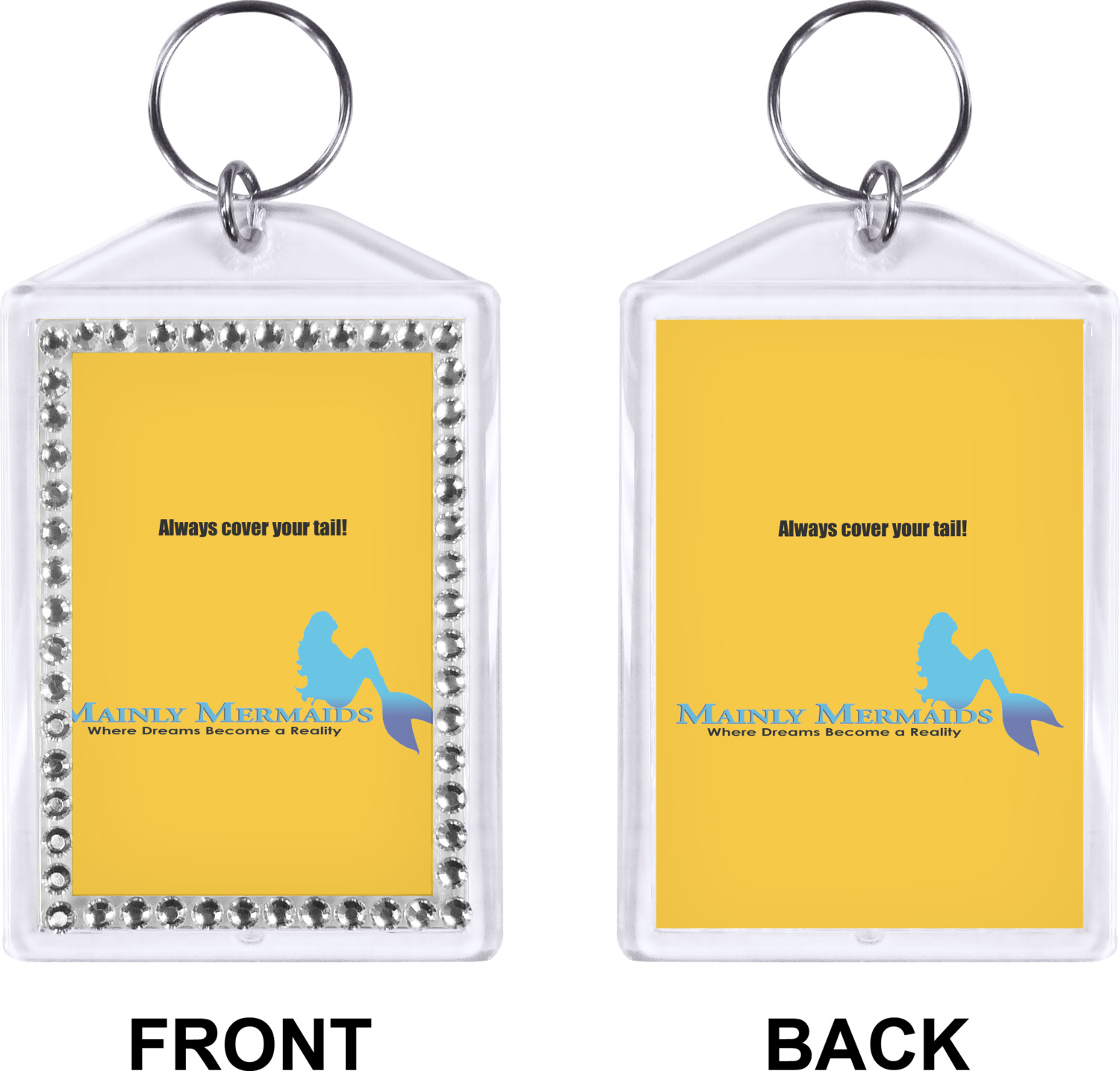 Our personalized keychains have a bold, rectangular shape, outlined by a series of shimmering rhinestones. A metal, split keyring is included with your purchase, and an additional metal hoop allows for attachment of the keychain to the split ring. This unique keychain measures at about 3.75 by 2.5 inches. We print your customized design(s) across both the back and front of this keychain.