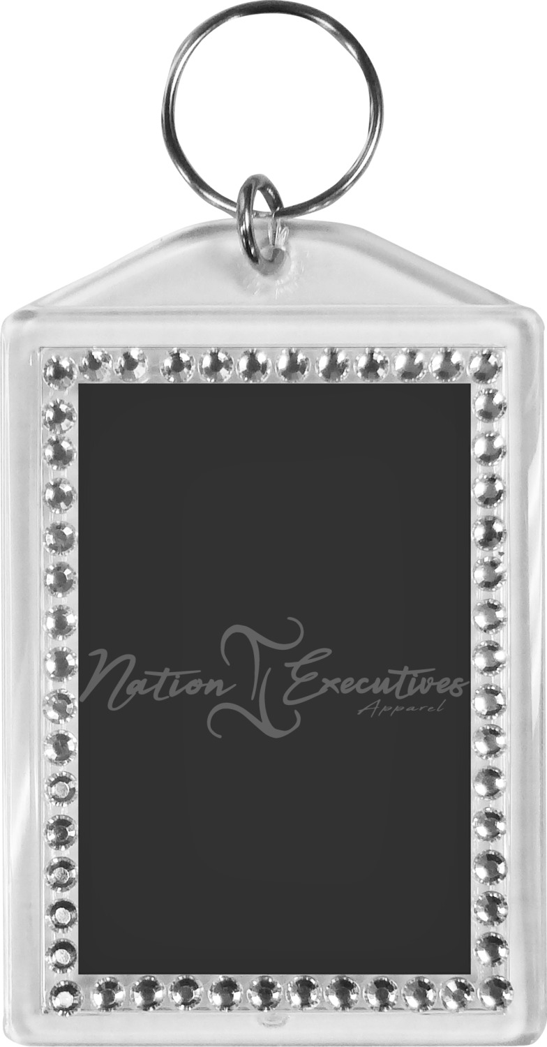 Our personalized keychains have a bold, rectangular shape, outlined by a series of shimmering rhinestones. A metal, split keyring is included with your purchase, and an additional metal hoop allows for attachment of the keychain to the split ring. This unique keychain measures at about 3.75 by 2.5 inches. We print your customized design(s) across both the back and front of this keychain.
