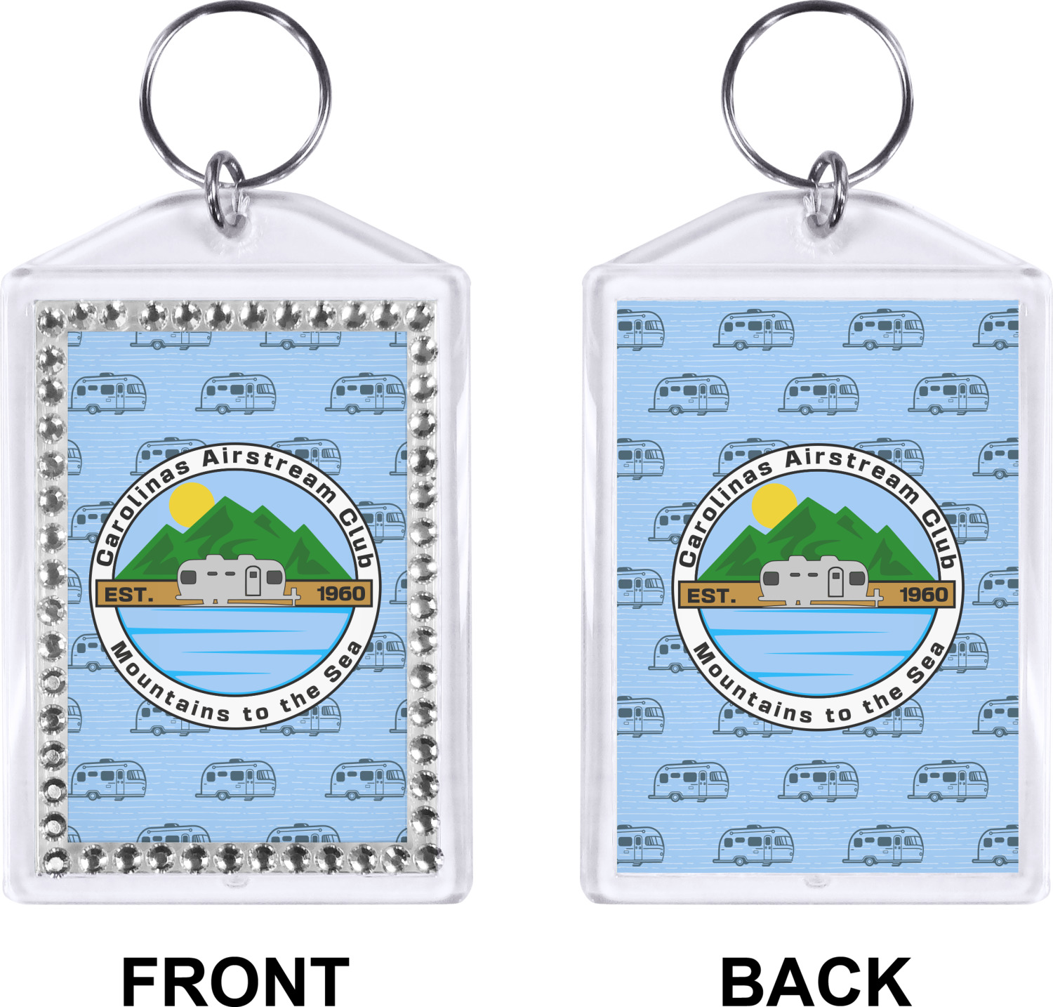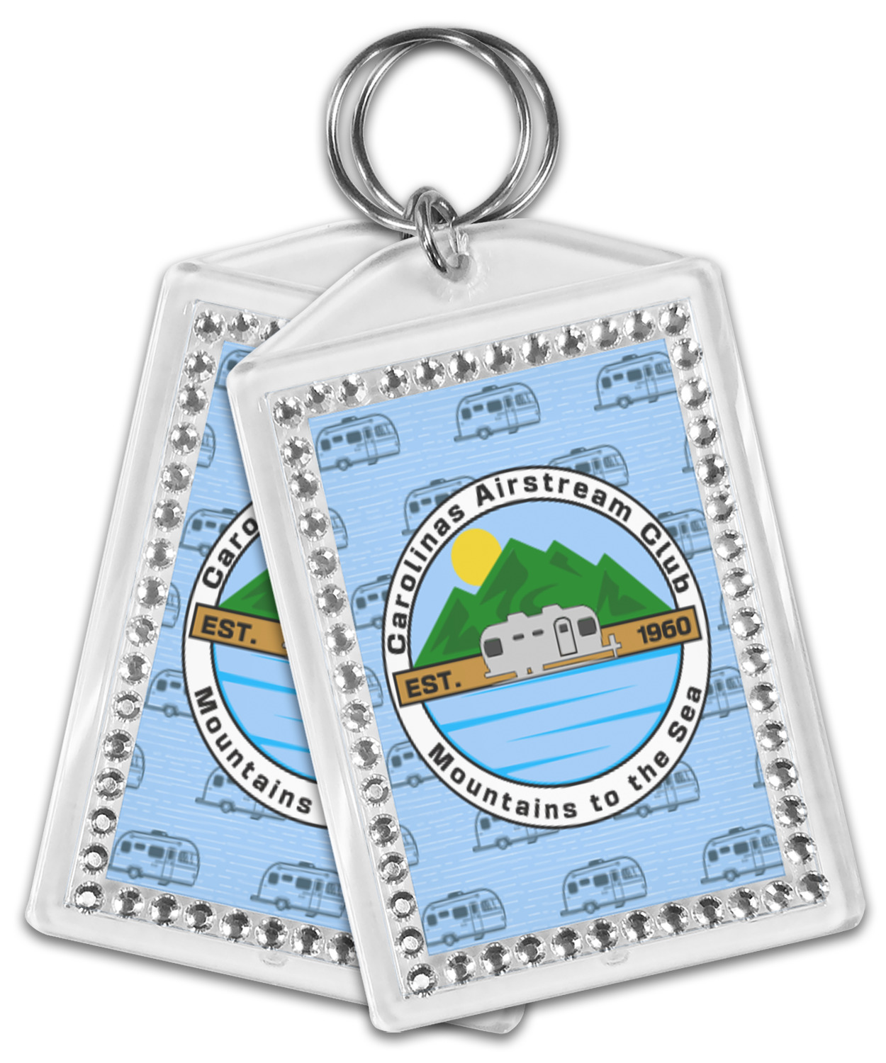 Our personalized keychains have a bold, rectangular shape, outlined by a series of shimmering rhinestones. A metal, split keyring is included with your purchase, and an additional metal hoop allows for attachment of the keychain to the split ring. This unique keychain measures at about 3.75 by 2.5 inches. We print your customized design(s) across both the back and front of this keychain.