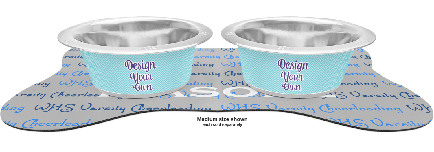 The top of this mat displays your custom design, as it is printed on polyester. To prevent slippage, the underside of the mat is made of rubber. We offer a small dog food mat, suitable for smaller dogs and a large dog food mat for bigger breeds. The small dog food mat is approximately 19 by 13 inches, while the large dog feeding mat measures at approximately 26.75 by 18 inches. Both personalized mats are ideally sized to fit two dog bowls.