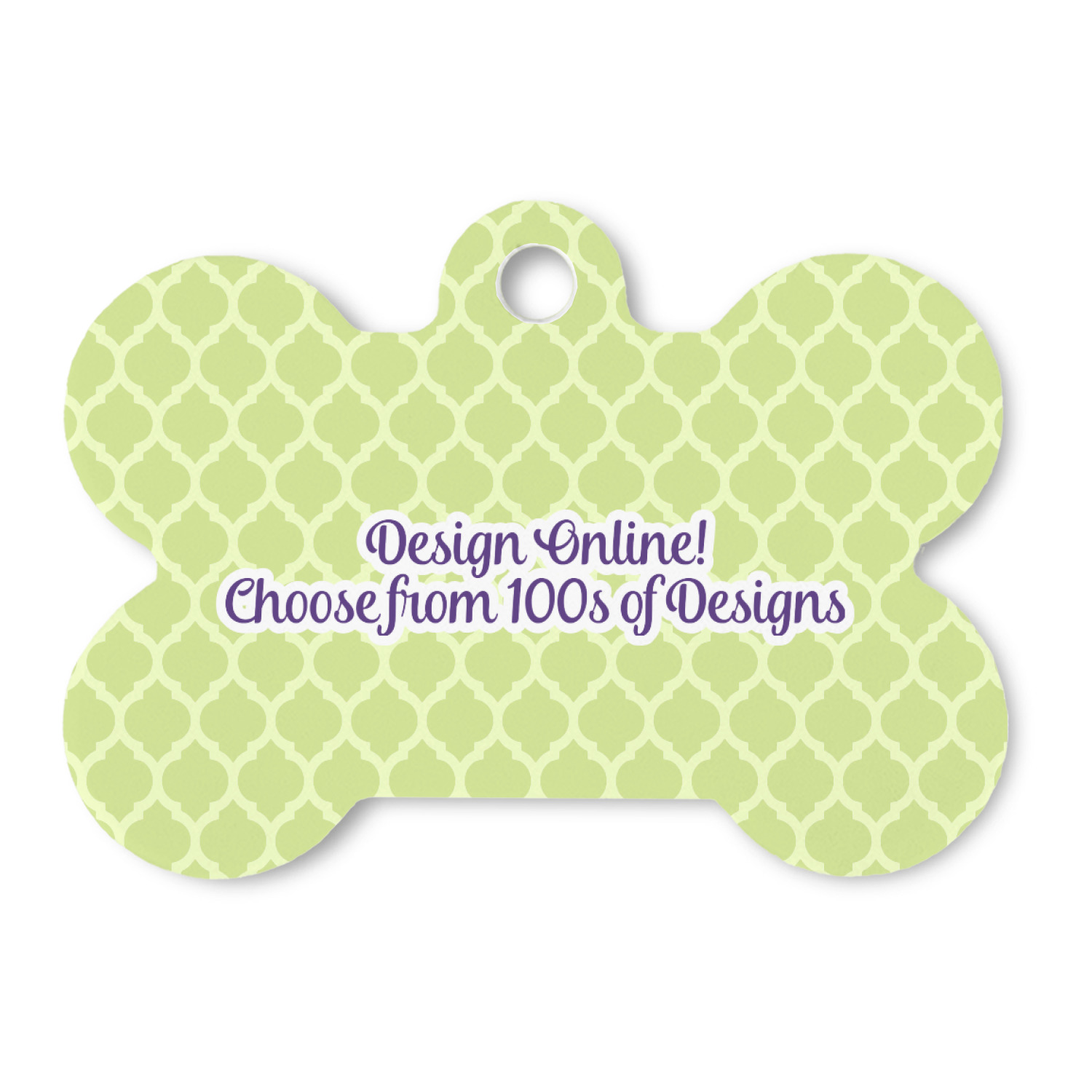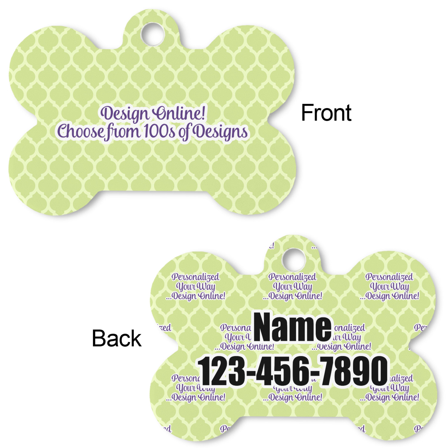 Our default design templates print your dog's personalization on the front and your contact information on the back; however everything is customizable, so you customize the patterns, the colors, the personalization, the contact information etc.
