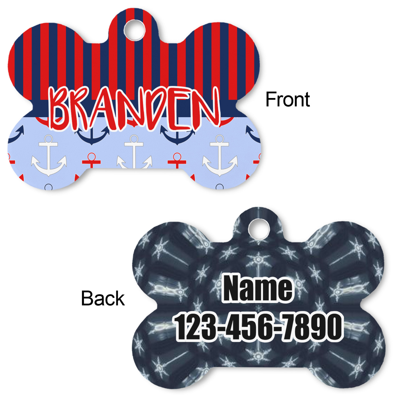 Our default design templates print your dog's personalization on the front and your contact information on the back; however everything is customizable, so you customize the patterns, the colors, the personalization, the contact information etc.