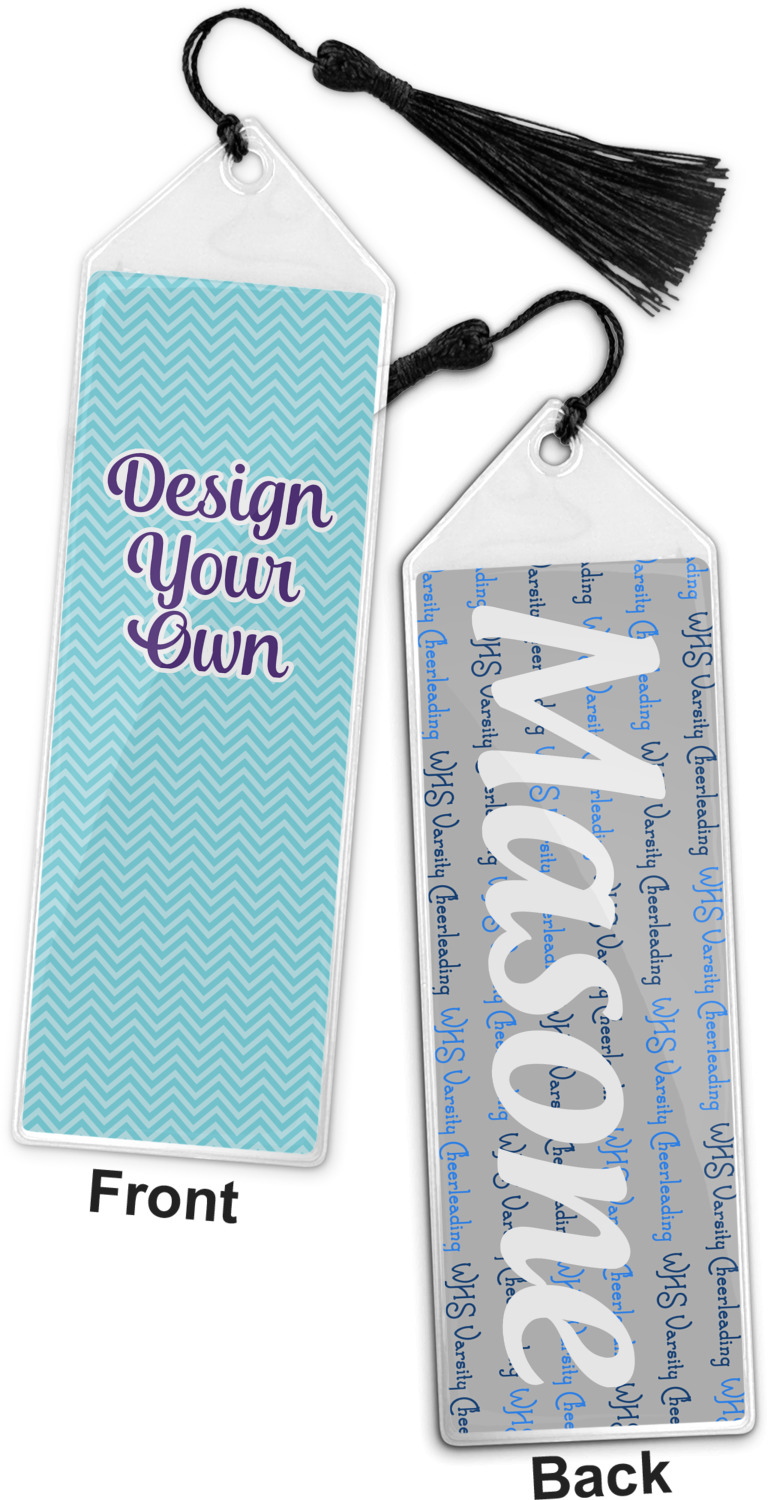 Your personalized bookmark is made of a sturdy, clear vinyl, and is approximately 7.5" x 2.25". We display your personalization on vinyl inserts that are placed on both sides. Accompanying each book marker is a black, fringe tassel that attaches to the reinforced, triangular header.
