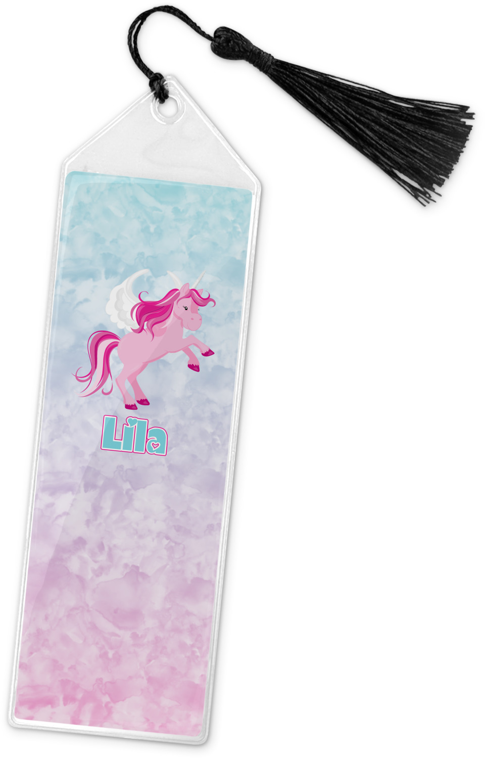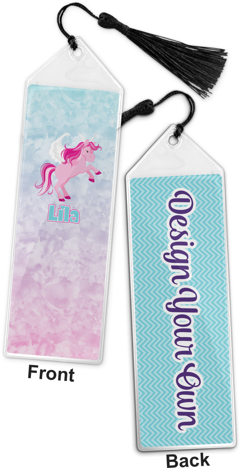 Your personalized bookmark is made of a sturdy, clear vinyl, and is approximately 7.5" x 2.25". We display your personalization on vinyl inserts that are placed on both sides. Accompanying each book marker is a black, fringe tassel that attaches to the reinforced, triangular header.