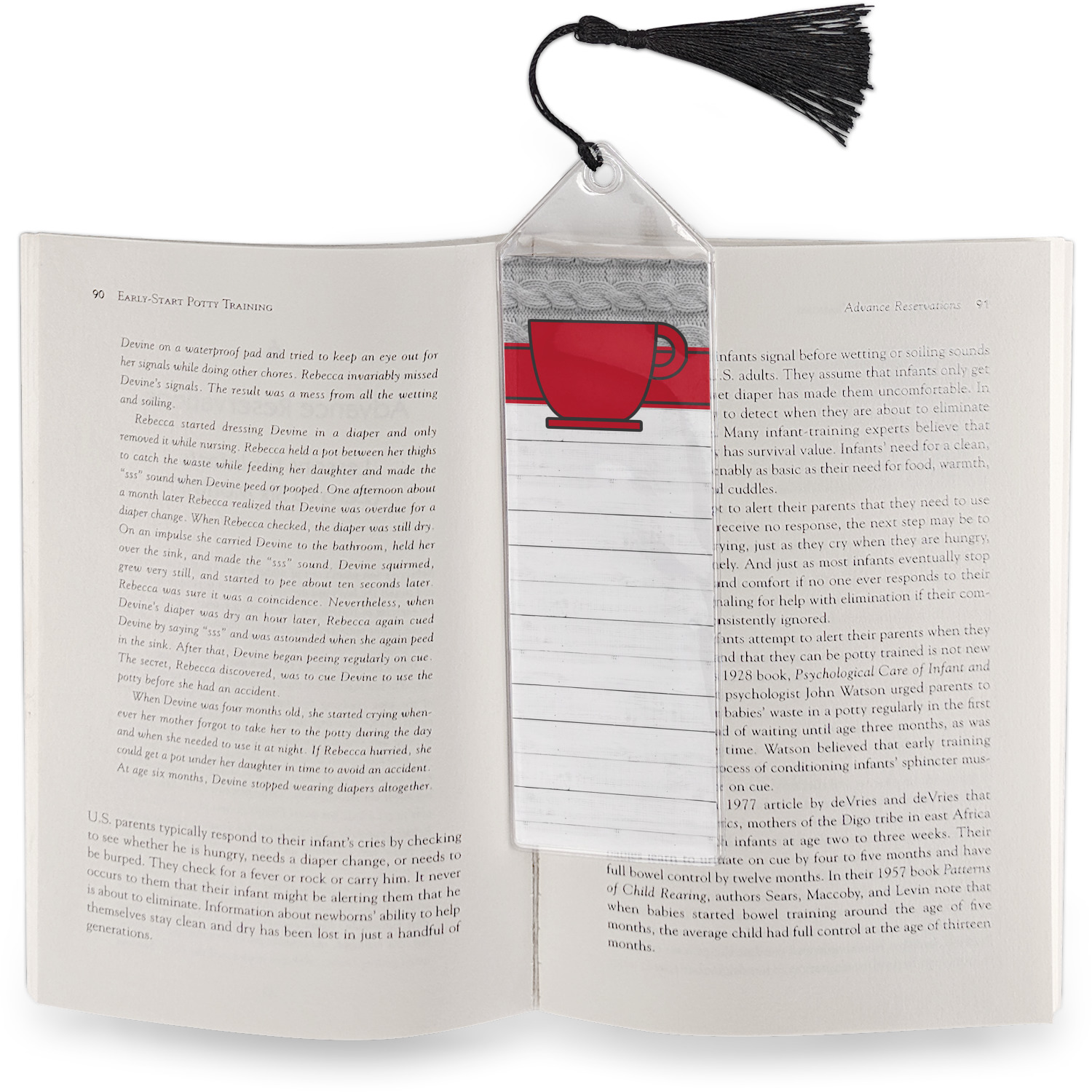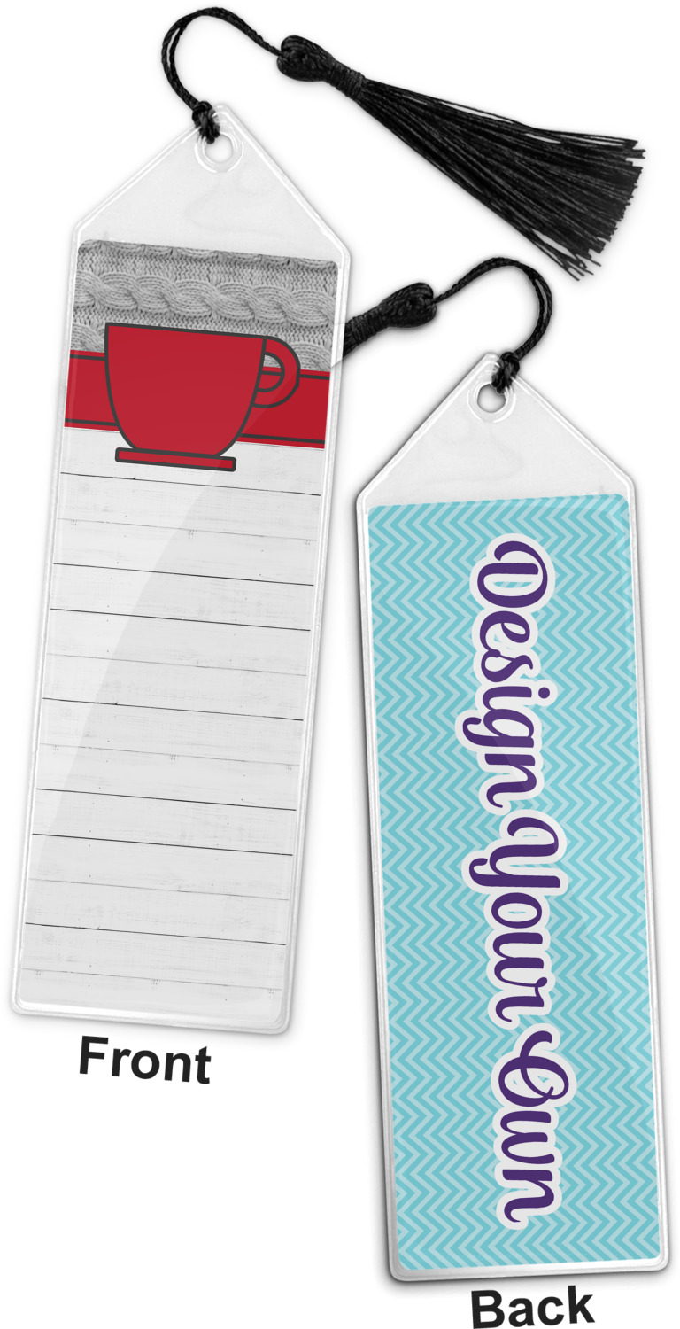 Your personalized bookmark is made of a sturdy, clear vinyl, and is approximately 7.5" x 2.25". We display your personalization on vinyl inserts that are placed on both sides. Accompanying each book marker is a black, fringe tassel that attaches to the reinforced, triangular header.