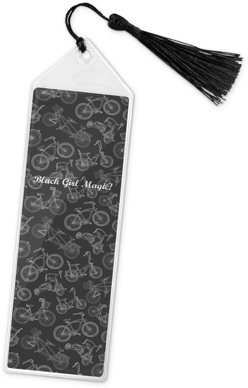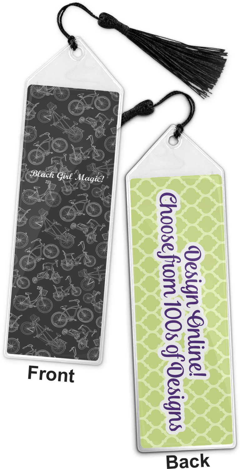 Your personalized bookmark is made of a sturdy, clear vinyl, and is approximately 7.5" x 2.25". We display your personalization on vinyl inserts that are placed on both sides. Accompanying each book marker is a black, fringe tassel that attaches to the reinforced, triangular header.