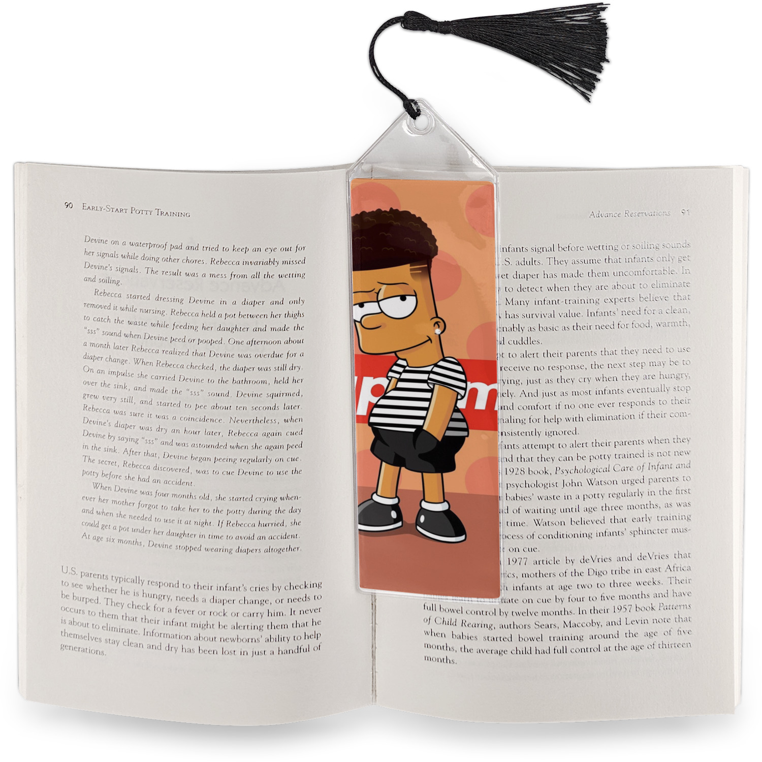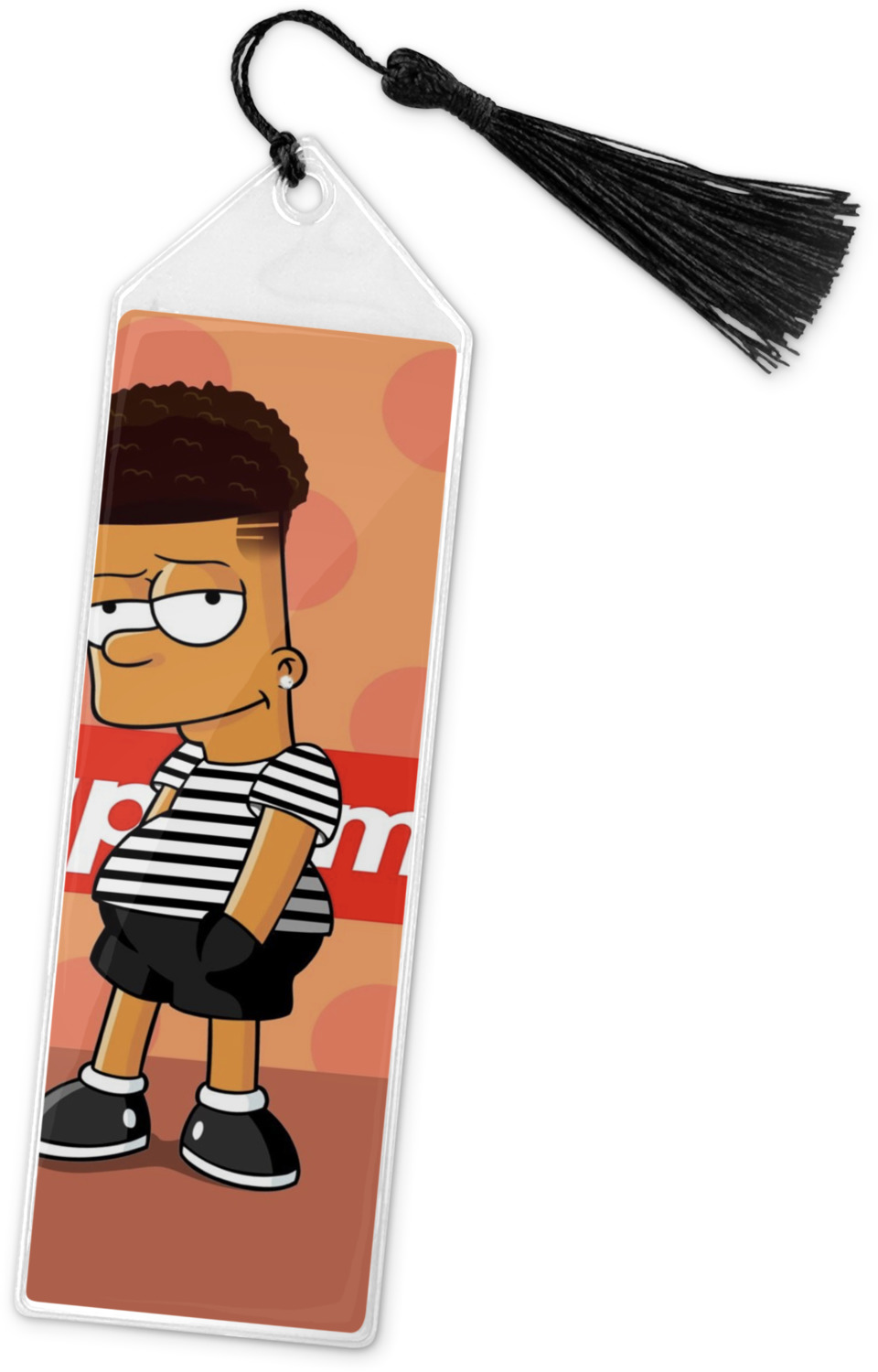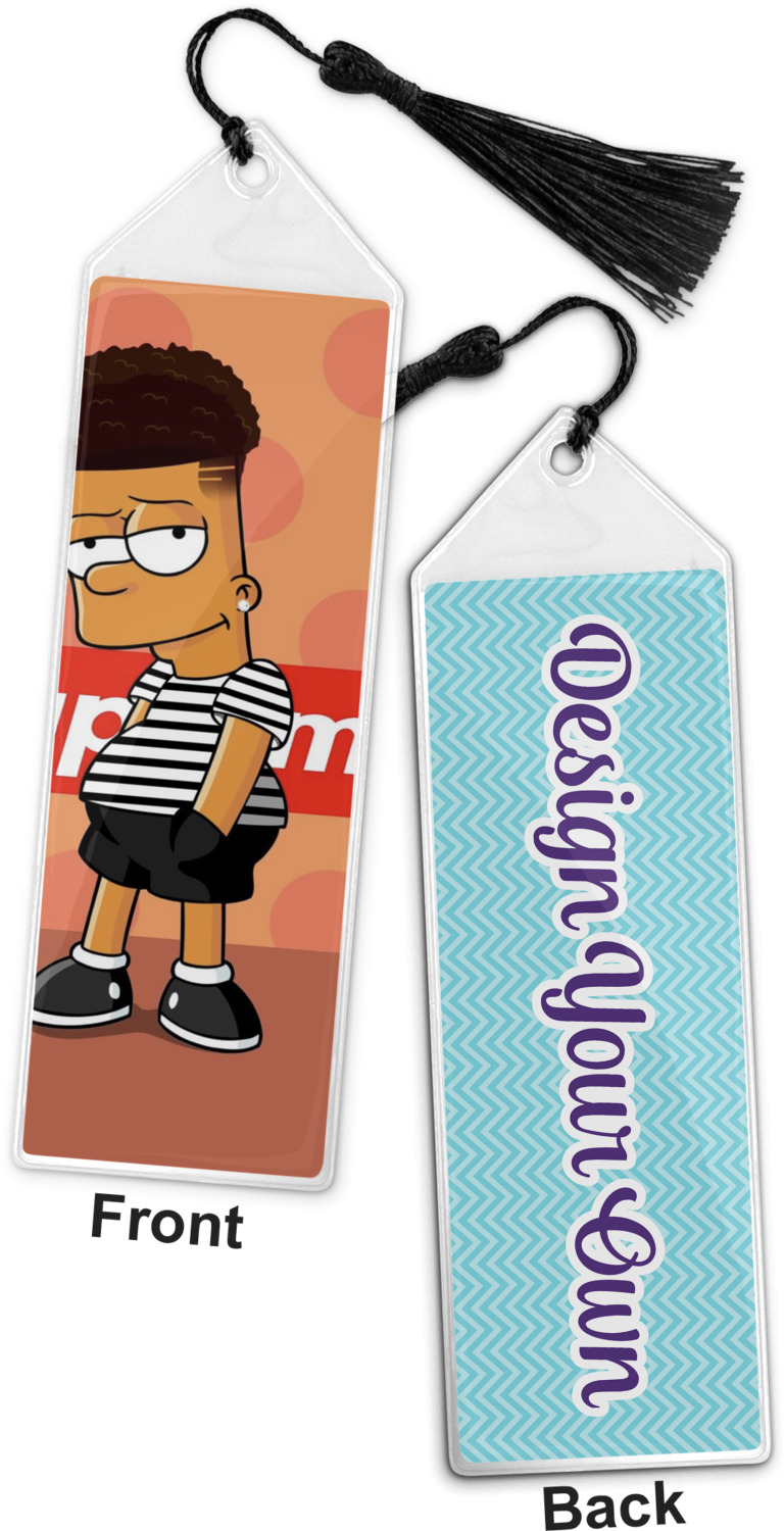 Your personalized bookmark is made of a sturdy, clear vinyl, and is approximately 7.5" x 2.25". We display your personalization on vinyl inserts that are placed on both sides. Accompanying each book marker is a black, fringe tassel that attaches to the reinforced, triangular header.