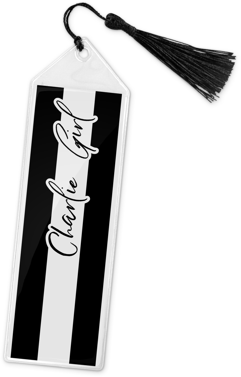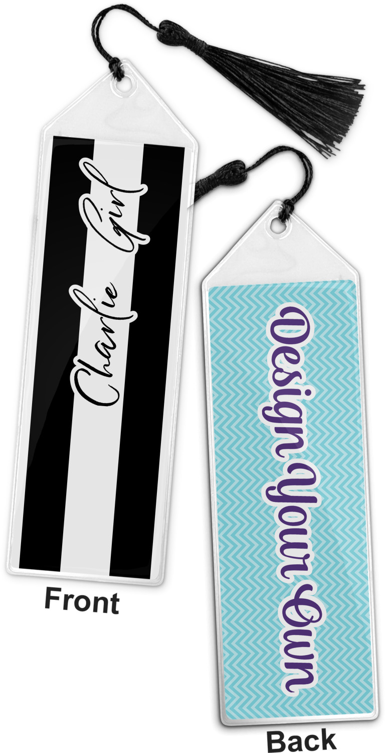 Your personalized bookmark is made of a sturdy, clear vinyl, and is approximately 7.5" x 2.25". We display your personalization on vinyl inserts that are placed on both sides. Accompanying each book marker is a black, fringe tassel that attaches to the reinforced, triangular header.
