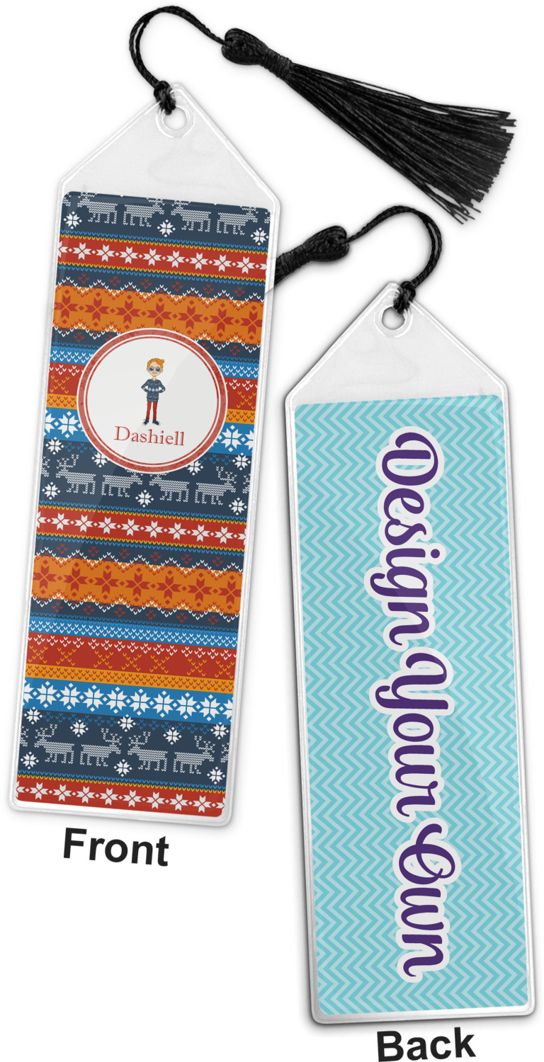Your personalized bookmark is made of a sturdy, clear vinyl, and is approximately 7.5" x 2.25". We display your personalization on vinyl inserts that are placed on both sides. Accompanying each book marker is a black, fringe tassel that attaches to the reinforced, triangular header.