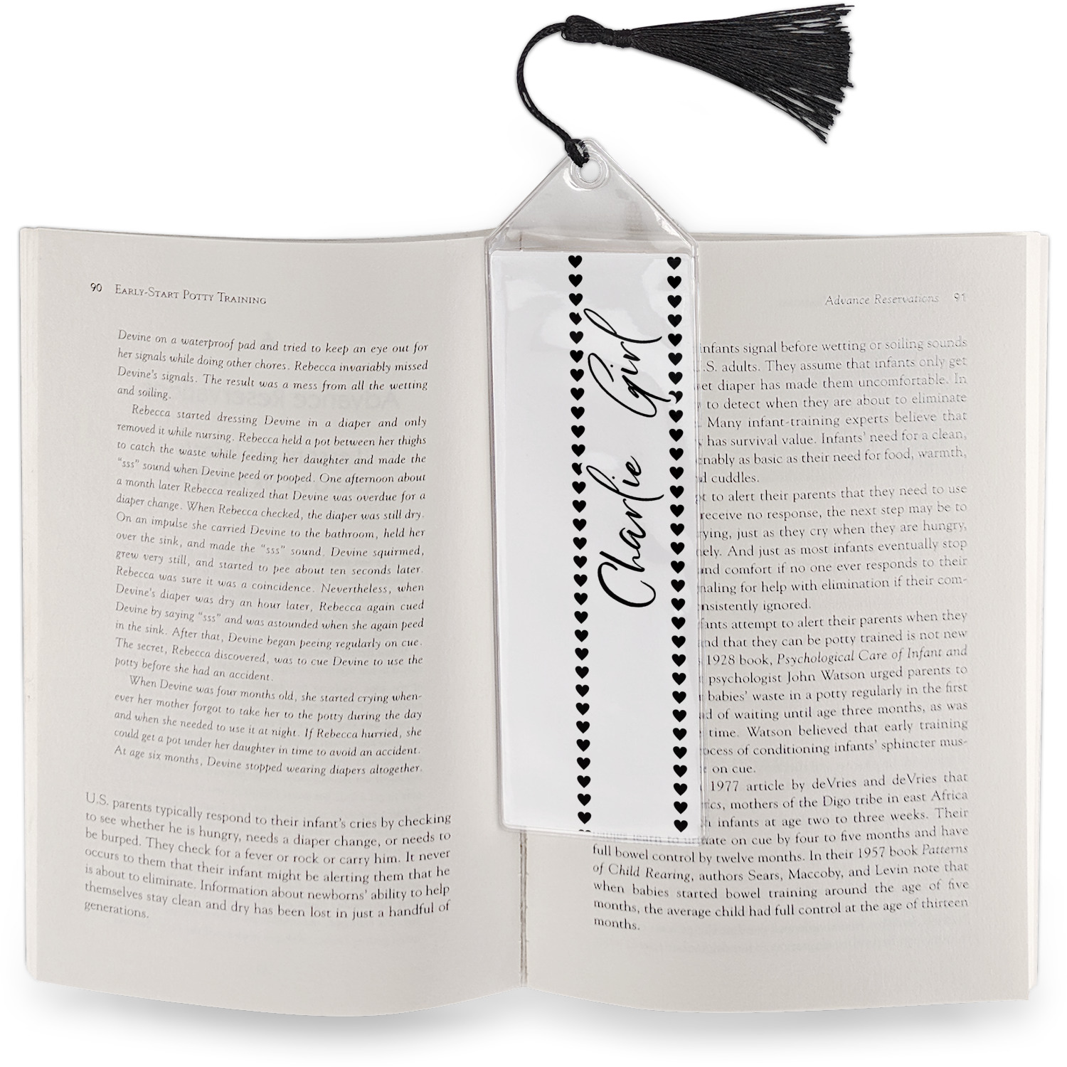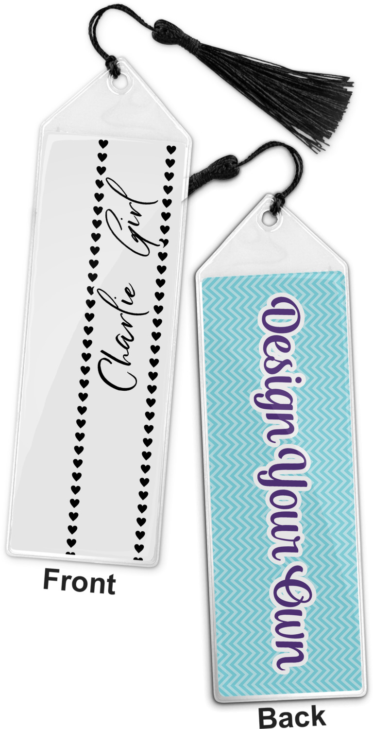 Your personalized bookmark is made of a sturdy, clear vinyl, and is approximately 7.5" x 2.25". We display your personalization on vinyl inserts that are placed on both sides. Accompanying each book marker is a black, fringe tassel that attaches to the reinforced, triangular header.