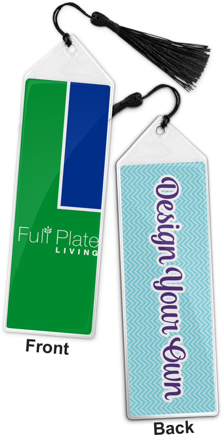 Your personalized bookmark is made of a sturdy, clear vinyl, and is approximately 7.5" x 2.25". We display your personalization on vinyl inserts that are placed on both sides. Accompanying each book marker is a black, fringe tassel that attaches to the reinforced, triangular header.