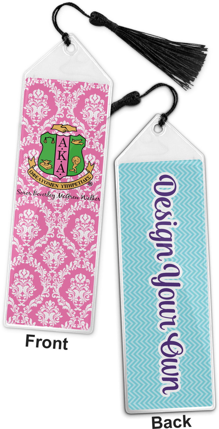Your personalized bookmark is made of a sturdy, clear vinyl, and is approximately 7.5" x 2.25". We display your personalization on vinyl inserts that are placed on both sides. Accompanying each book marker is a black, fringe tassel that attaches to the reinforced, triangular header.