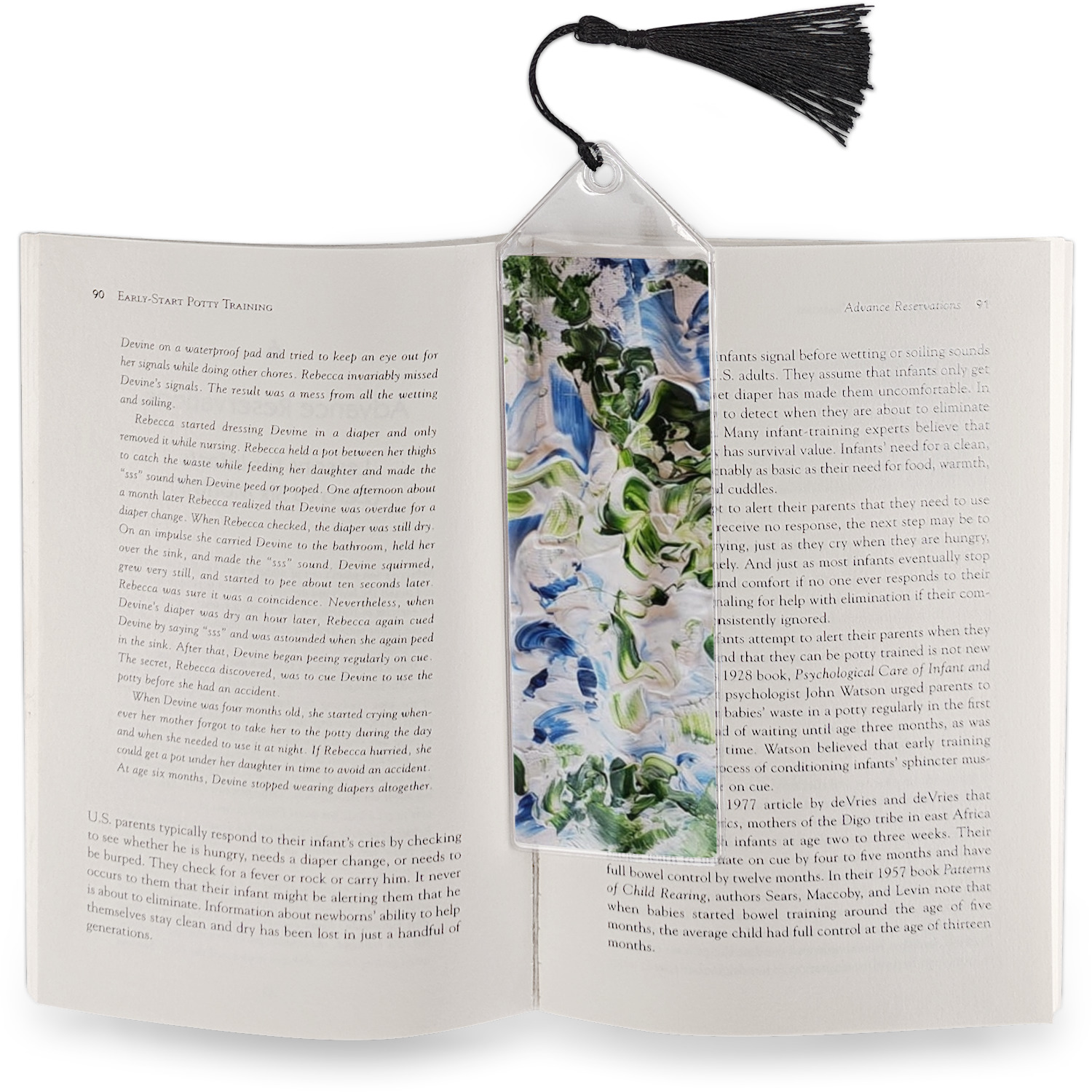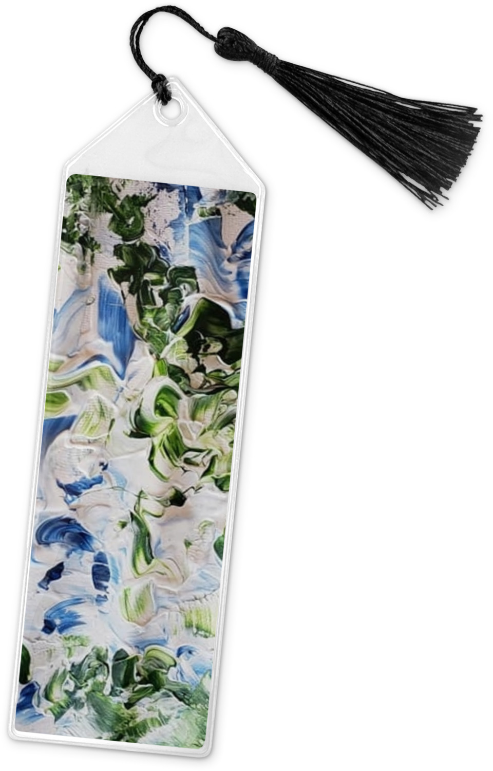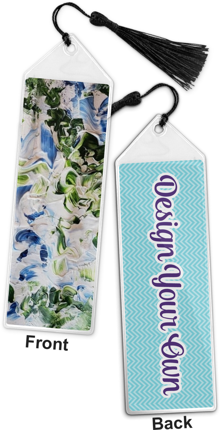 Your personalized bookmark is made of a sturdy, clear vinyl, and is approximately 7.5" x 2.25". We display your personalization on vinyl inserts that are placed on both sides. Accompanying each book marker is a black, fringe tassel that attaches to the reinforced, triangular header.