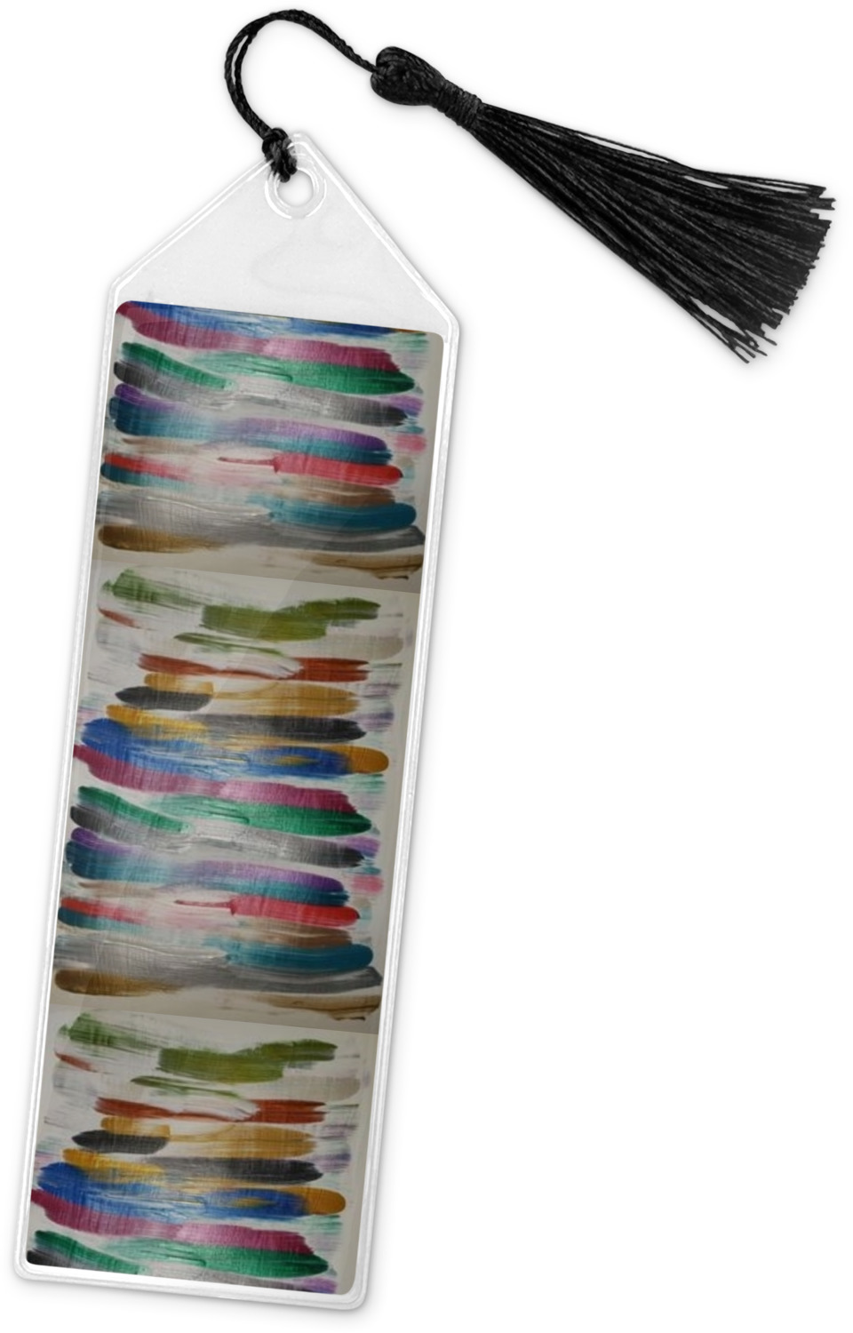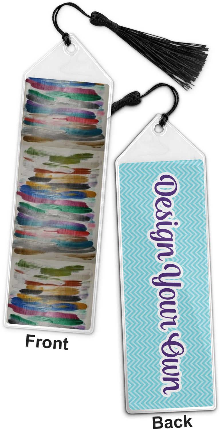 Your personalized bookmark is made of a sturdy, clear vinyl, and is approximately 7.5" x 2.25". We display your personalization on vinyl inserts that are placed on both sides. Accompanying each book marker is a black, fringe tassel that attaches to the reinforced, triangular header.