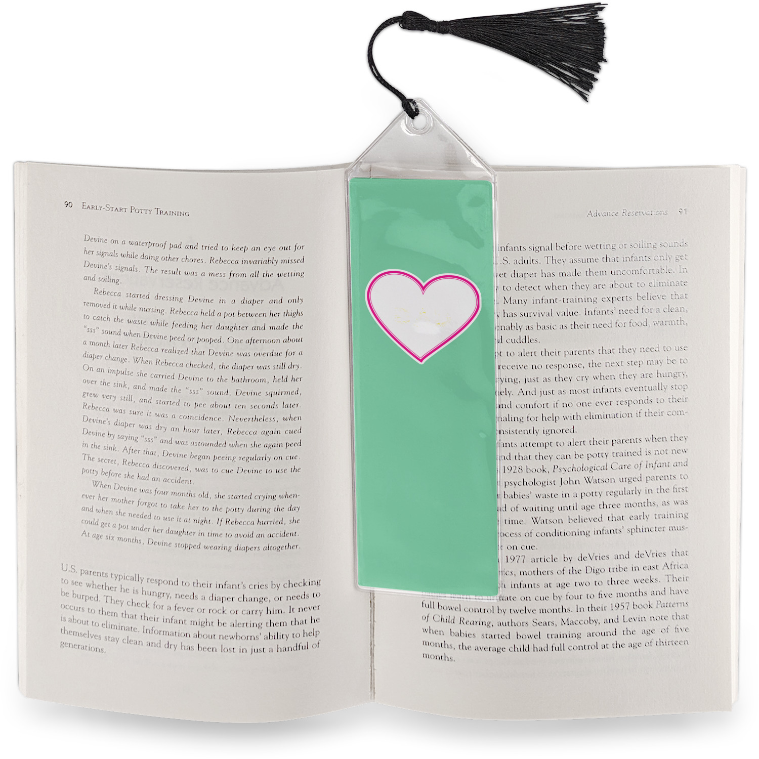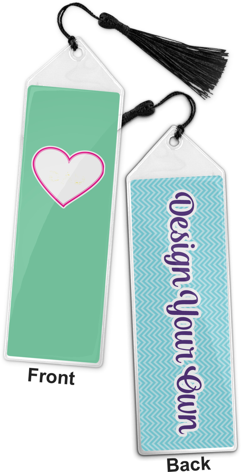 Your personalized bookmark is made of a sturdy, clear vinyl, and is approximately 7.5" x 2.25". We display your personalization on vinyl inserts that are placed on both sides. Accompanying each book marker is a black, fringe tassel that attaches to the reinforced, triangular header.