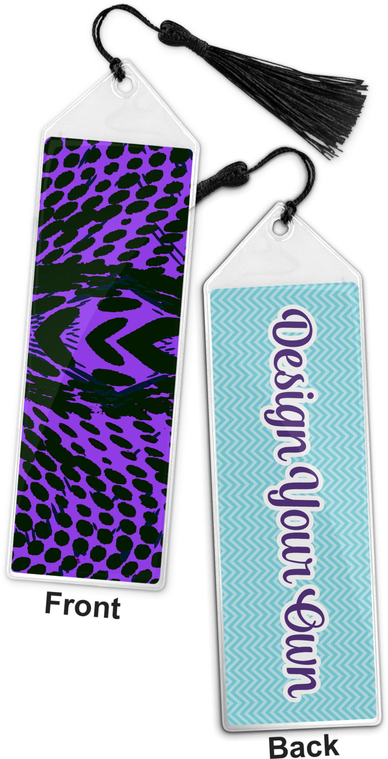 Your personalized bookmark is made of a sturdy, clear vinyl, and is approximately 7.5" x 2.25". We display your personalization on vinyl inserts that are placed on both sides. Accompanying each book marker is a black, fringe tassel that attaches to the reinforced, triangular header.