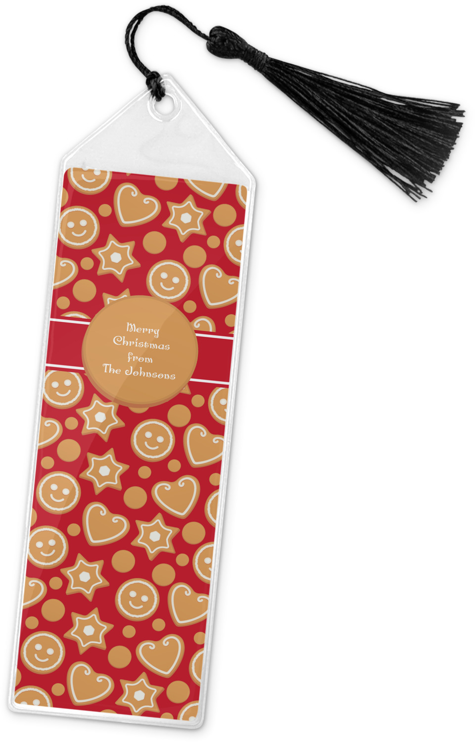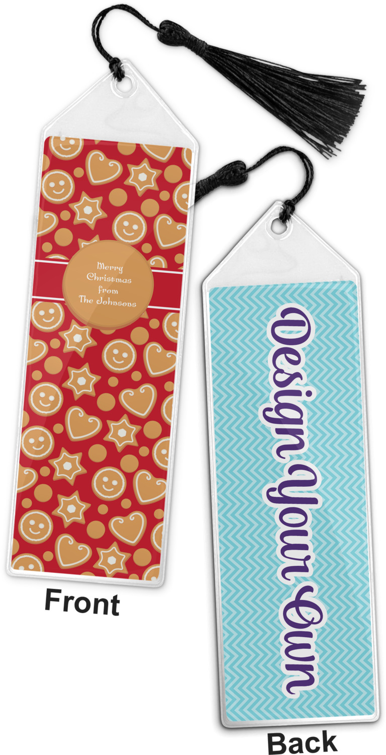 Your personalized bookmark is made of a sturdy, clear vinyl, and is approximately 7.5" x 2.25". We display your personalization on vinyl inserts that are placed on both sides. Accompanying each book marker is a black, fringe tassel that attaches to the reinforced, triangular header.