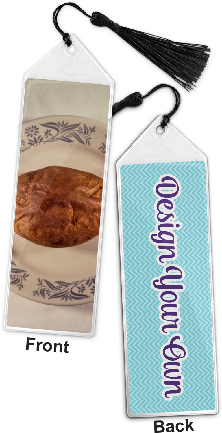 Your personalized bookmark is made of a sturdy, clear vinyl, and is approximately 7.5" x 2.25". We display your personalization on vinyl inserts that are placed on both sides. Accompanying each book marker is a black, fringe tassel that attaches to the reinforced, triangular header.