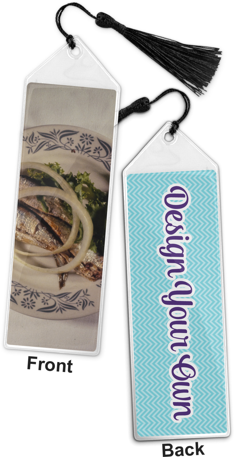Your personalized bookmark is made of a sturdy, clear vinyl, and is approximately 7.5" x 2.25". We display your personalization on vinyl inserts that are placed on both sides. Accompanying each book marker is a black, fringe tassel that attaches to the reinforced, triangular header.