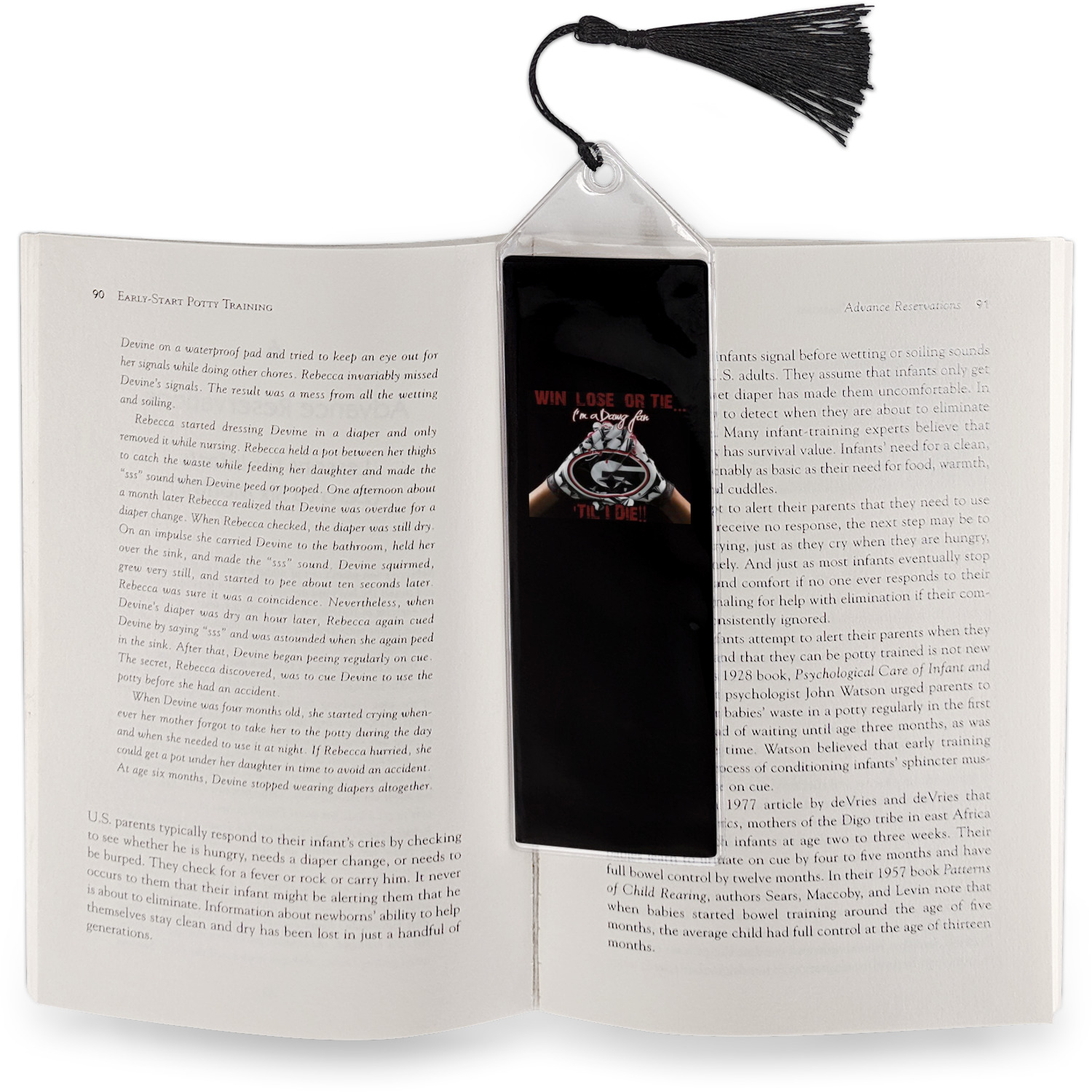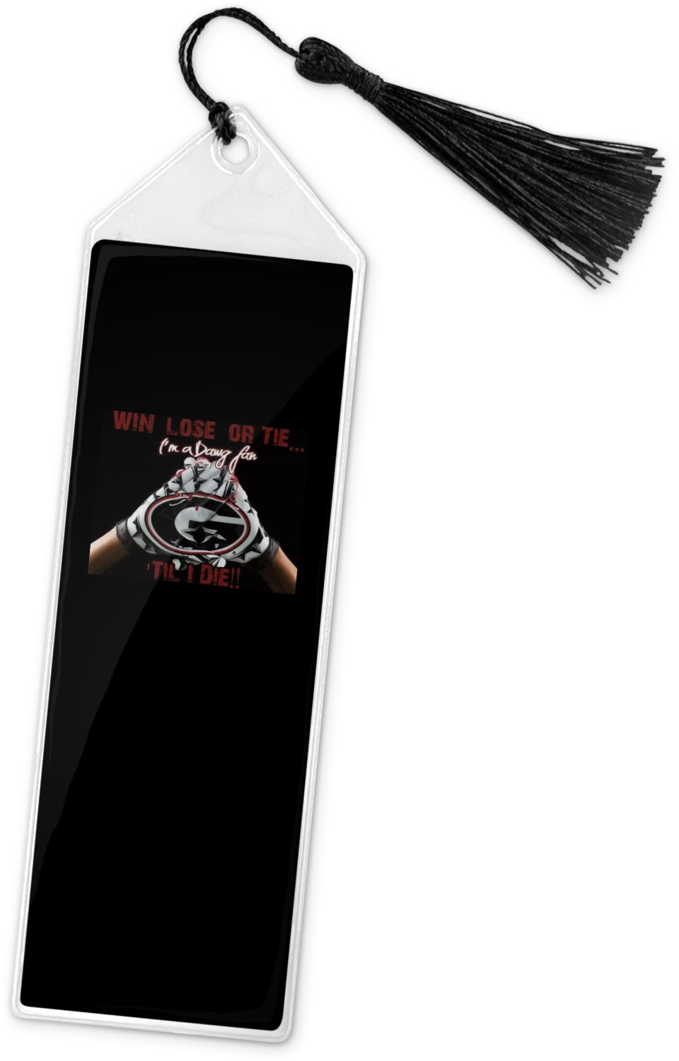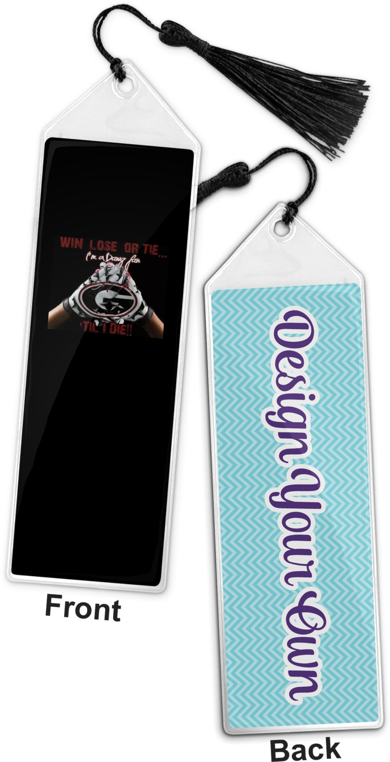 Your personalized bookmark is made of a sturdy, clear vinyl, and is approximately 7.5" x 2.25". We display your personalization on vinyl inserts that are placed on both sides. Accompanying each book marker is a black, fringe tassel that attaches to the reinforced, triangular header.