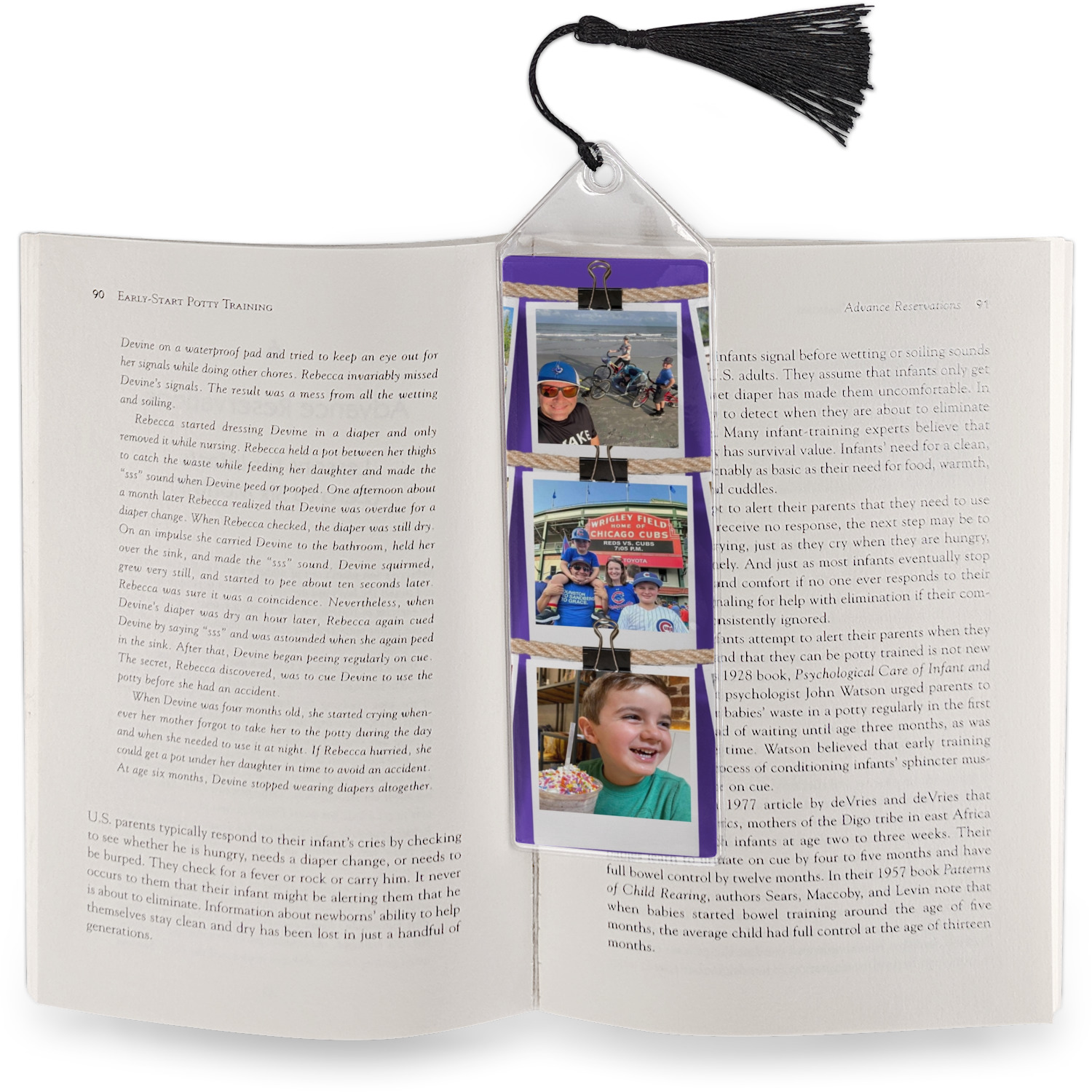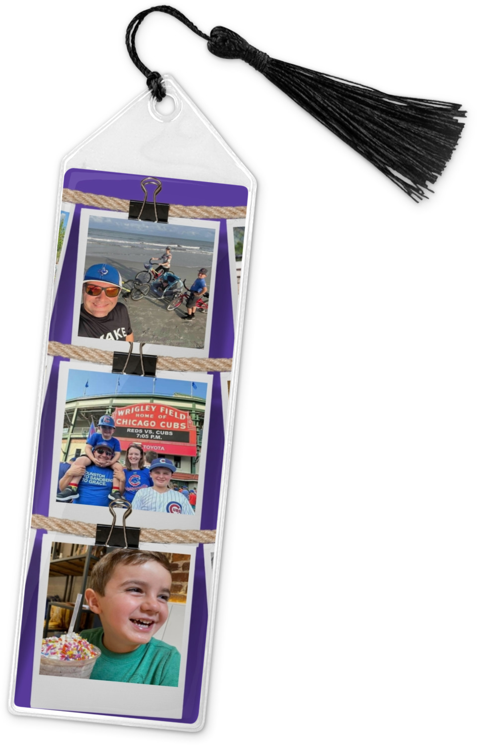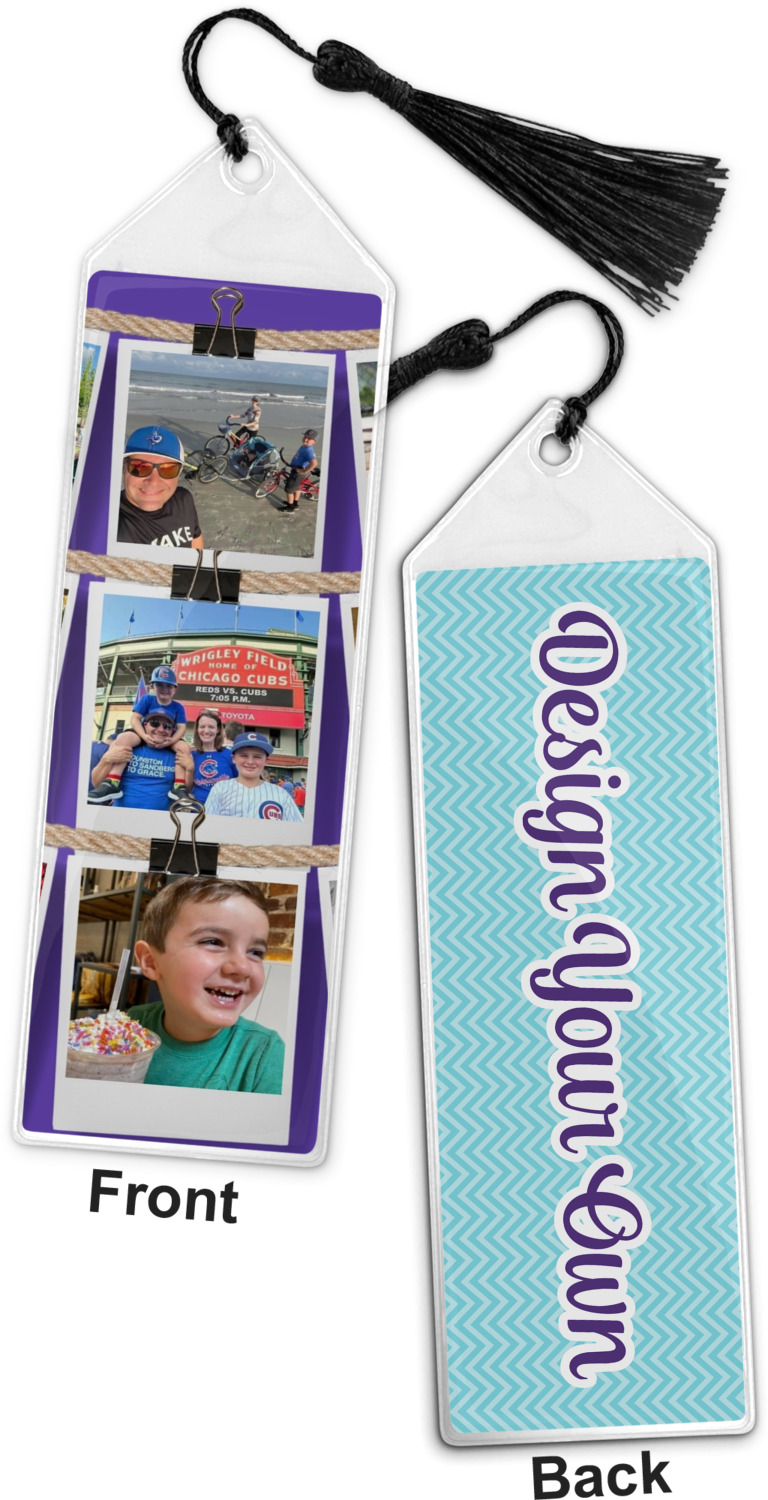 Your personalized bookmark is made of a sturdy, clear vinyl, and is approximately 7.5" x 2.25". We display your personalization on vinyl inserts that are placed on both sides. Accompanying each book marker is a black, fringe tassel that attaches to the reinforced, triangular header.