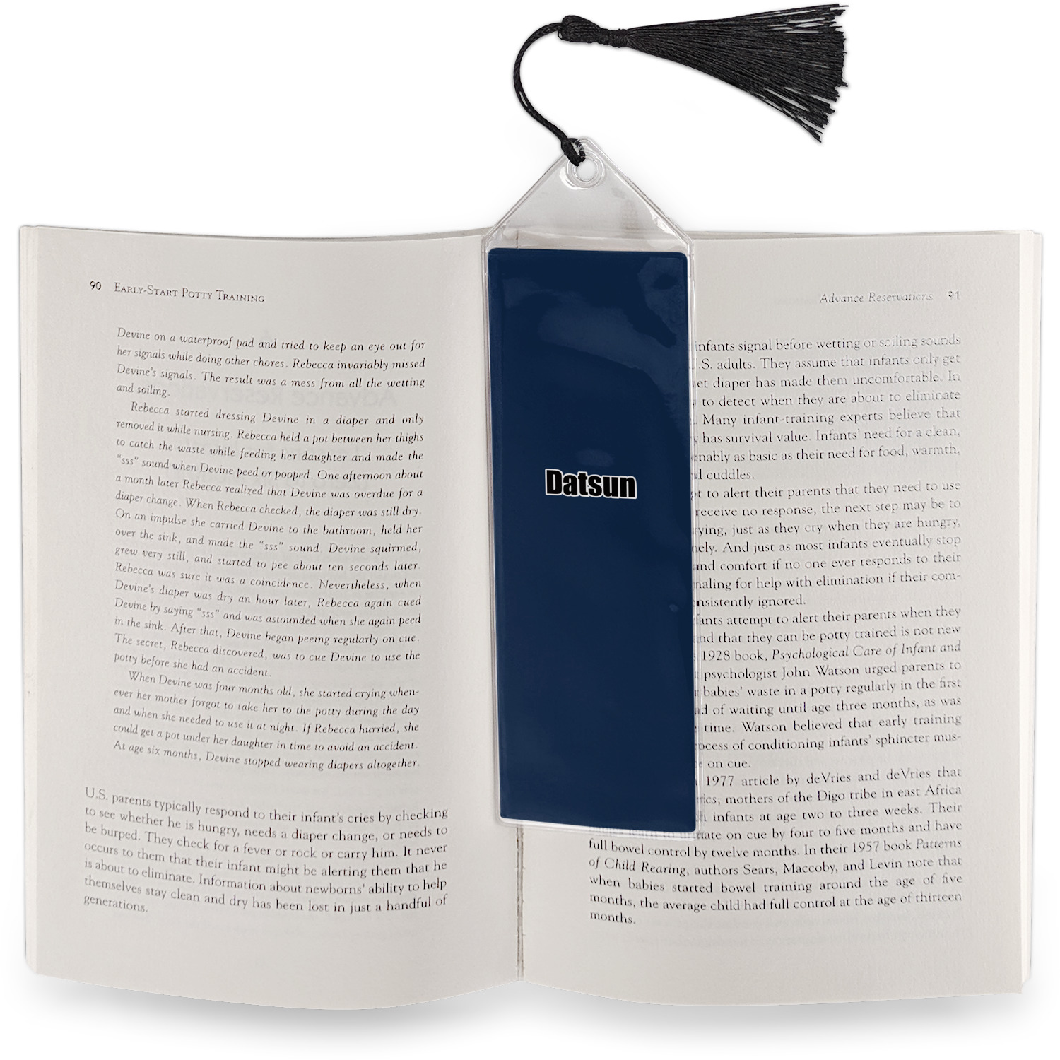 Your personalized bookmark is made of a sturdy, clear vinyl, and is approximately 7.5" x 2.25". We display your personalization on vinyl inserts that are placed on both sides. Accompanying each book marker is a black, fringe tassel that attaches to the reinforced, triangular header.