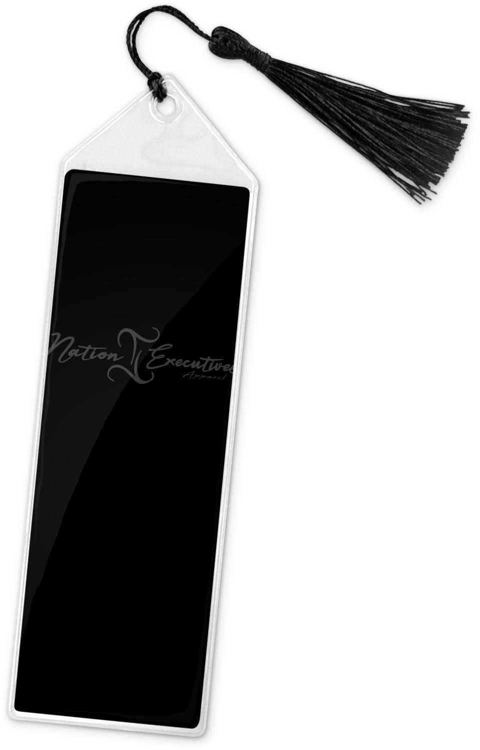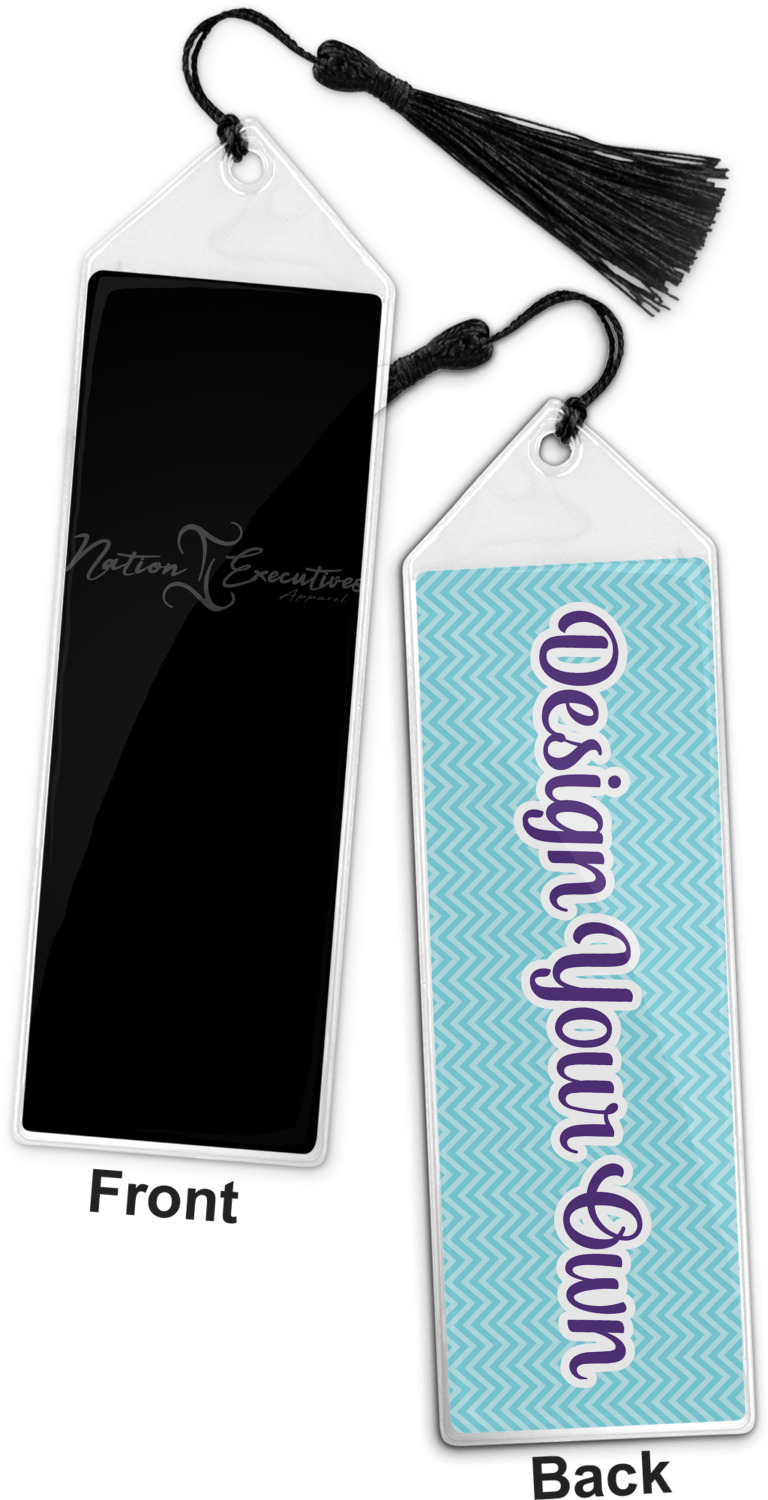 Your personalized bookmark is made of a sturdy, clear vinyl, and is approximately 7.5" x 2.25". We display your personalization on vinyl inserts that are placed on both sides. Accompanying each book marker is a black, fringe tassel that attaches to the reinforced, triangular header.