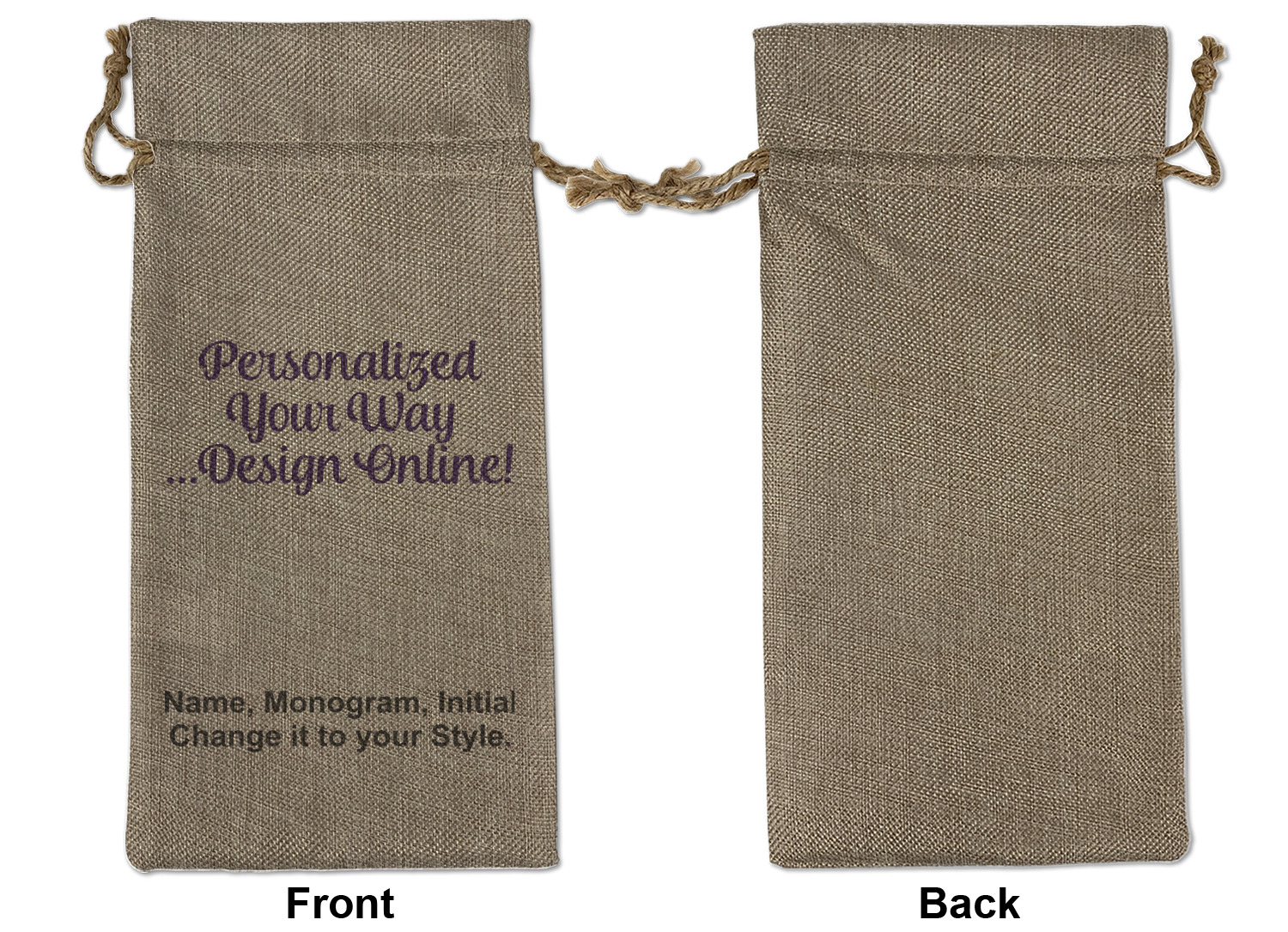 We sell our Burlap Gift Bags in 3 variant sized bags. Made with burlap polyester, each personalized bag can be secured with a twine drawstring pull. Your custom design is available to print on one side or both sides - completely up to you! The sizes of the bags measure approximately 4.5" x 6.5" for the smallest size, 6.5" x 8.0" for the medium size, and 6.5" x 13.5" for the large-sized bag.