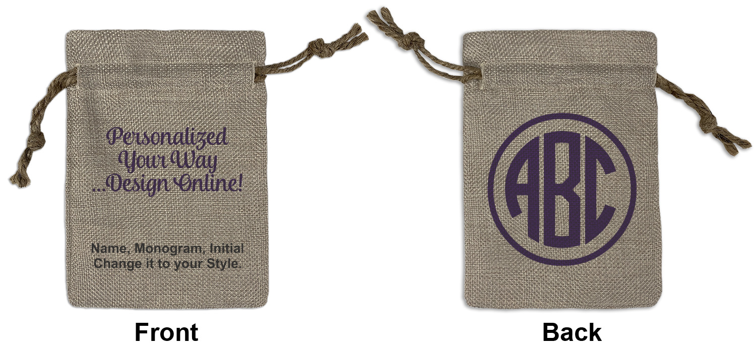 We sell our Burlap Gift Bags in 3 variant sized bags. Made with burlap polyester, each personalized bag can be secured with a twine drawstring pull. Your custom design is available to print on one side or both sides - completely up to you! The sizes of the bags measure approximately 4.5" x 6.5" for the smallest size, 6.5" x 8.0" for the medium size, and 6.5" x 13.5" for the large-sized bag.