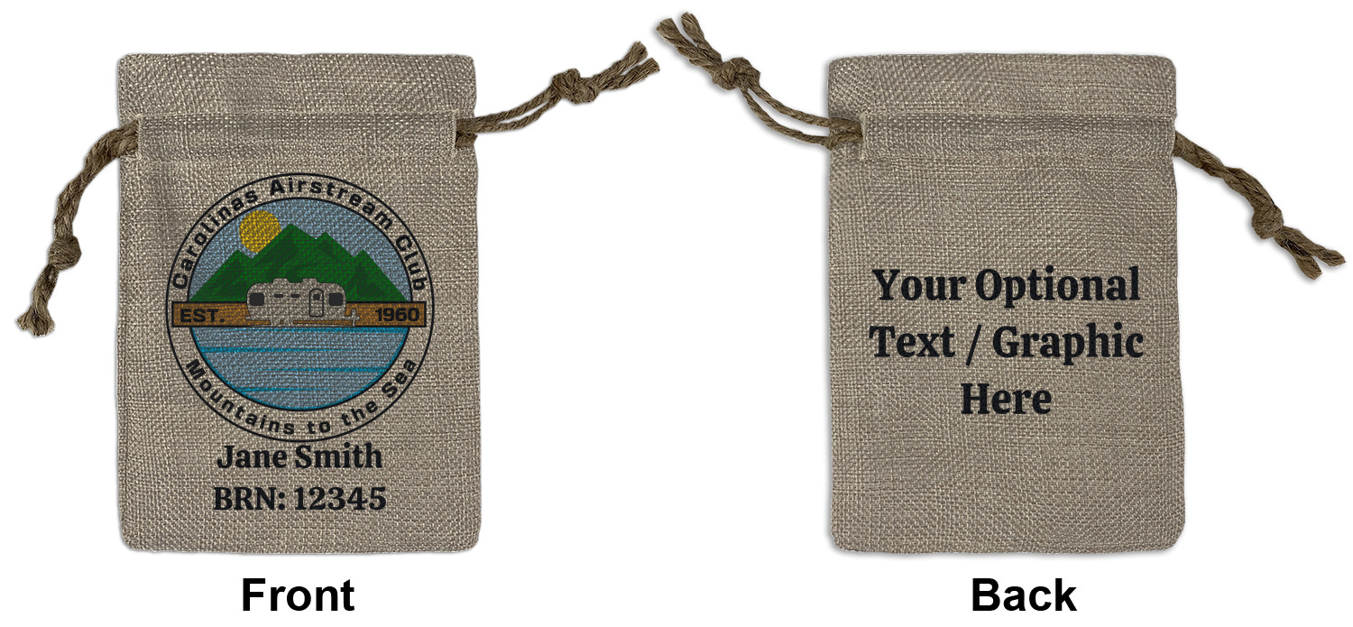 We sell our Burlap Gift Bags in 3 variant sized bags. Made with burlap polyester, each personalized bag can be secured with a twine drawstring pull. Your custom design is available to print on one side or both sides - completely up to you! The sizes of the bags measure approximately 4.5" x 6.5" for the smallest size, 6.5" x 8.0" for the medium size, and 6.5" x 13.5" for the large-sized bag.