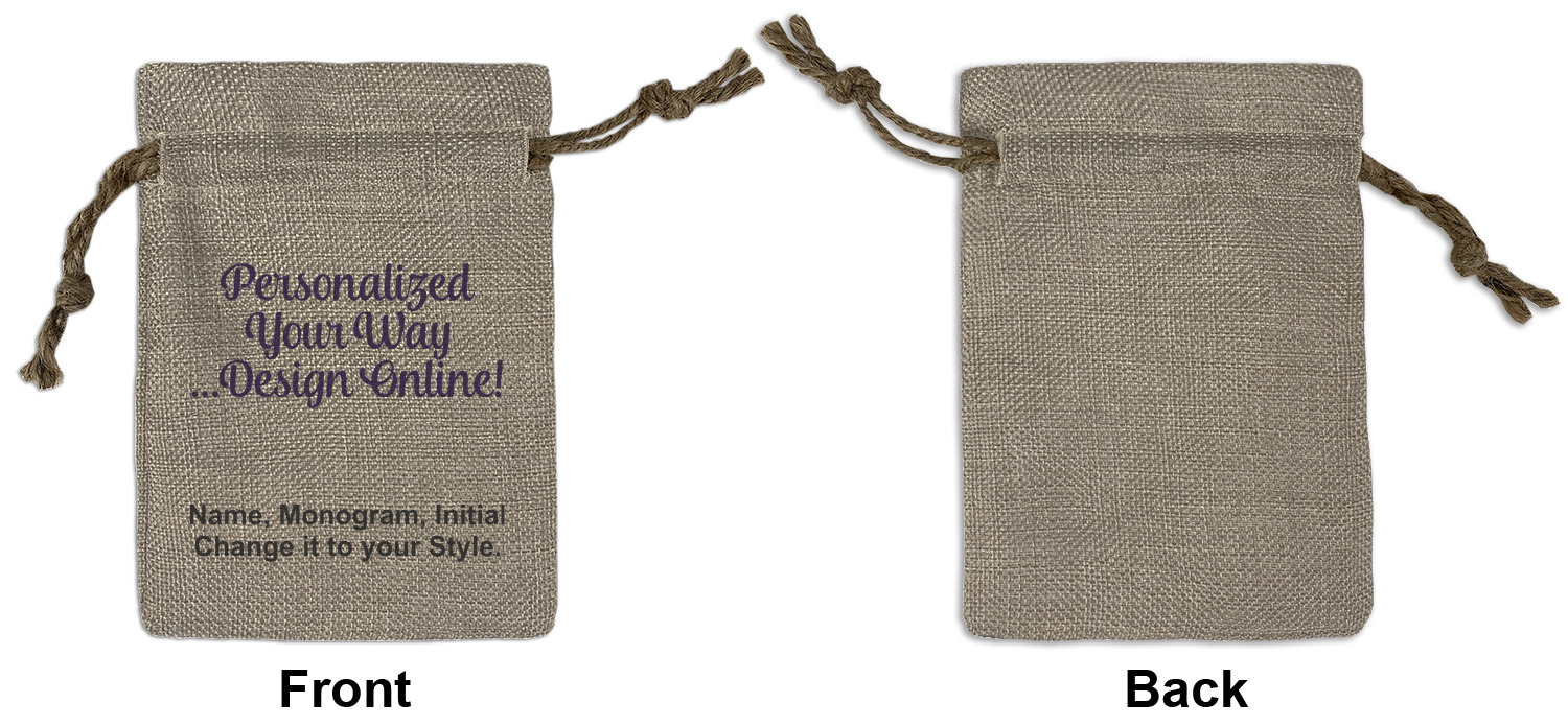 We sell our Burlap Gift Bags in 3 variant sized bags. Made with burlap polyester, each personalized bag can be secured with a twine drawstring pull. Your custom design is available to print on one side or both sides - completely up to you! The sizes of the bags measure approximately 4.5" x 6.5" for the smallest size, 6.5" x 8.0" for the medium size, and 6.5" x 13.5" for the large-sized bag.