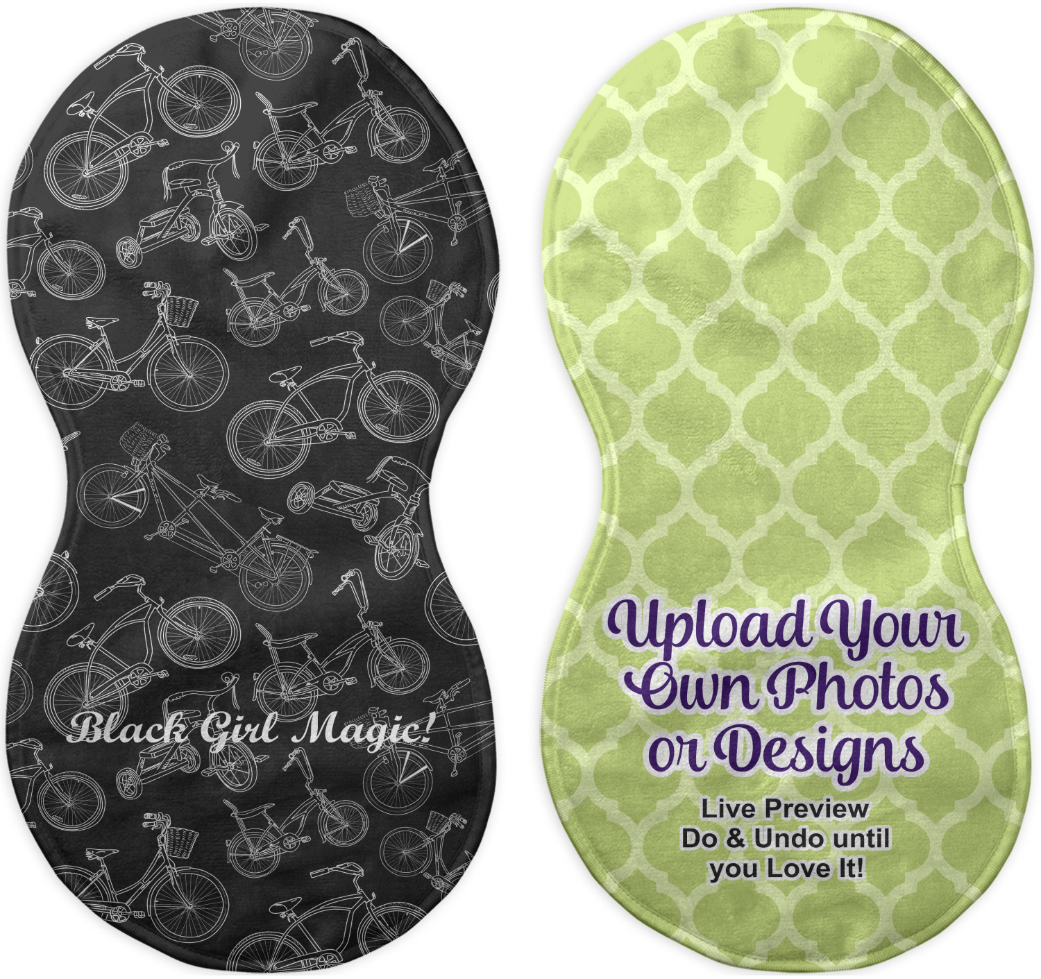Choose your baby burp cloth from our two styles - Fleece (rectangular) or Microfiber Velour (peanut shape). The lightweight and absorbent design makes each burp cloth multipurpose; use them as a burp pad, a lap pad, a changing table, or a spare cloth to clean up any baby mess. Your customization is displayed across the front with baby-safe ink to ensure extra comfort with a white backing.