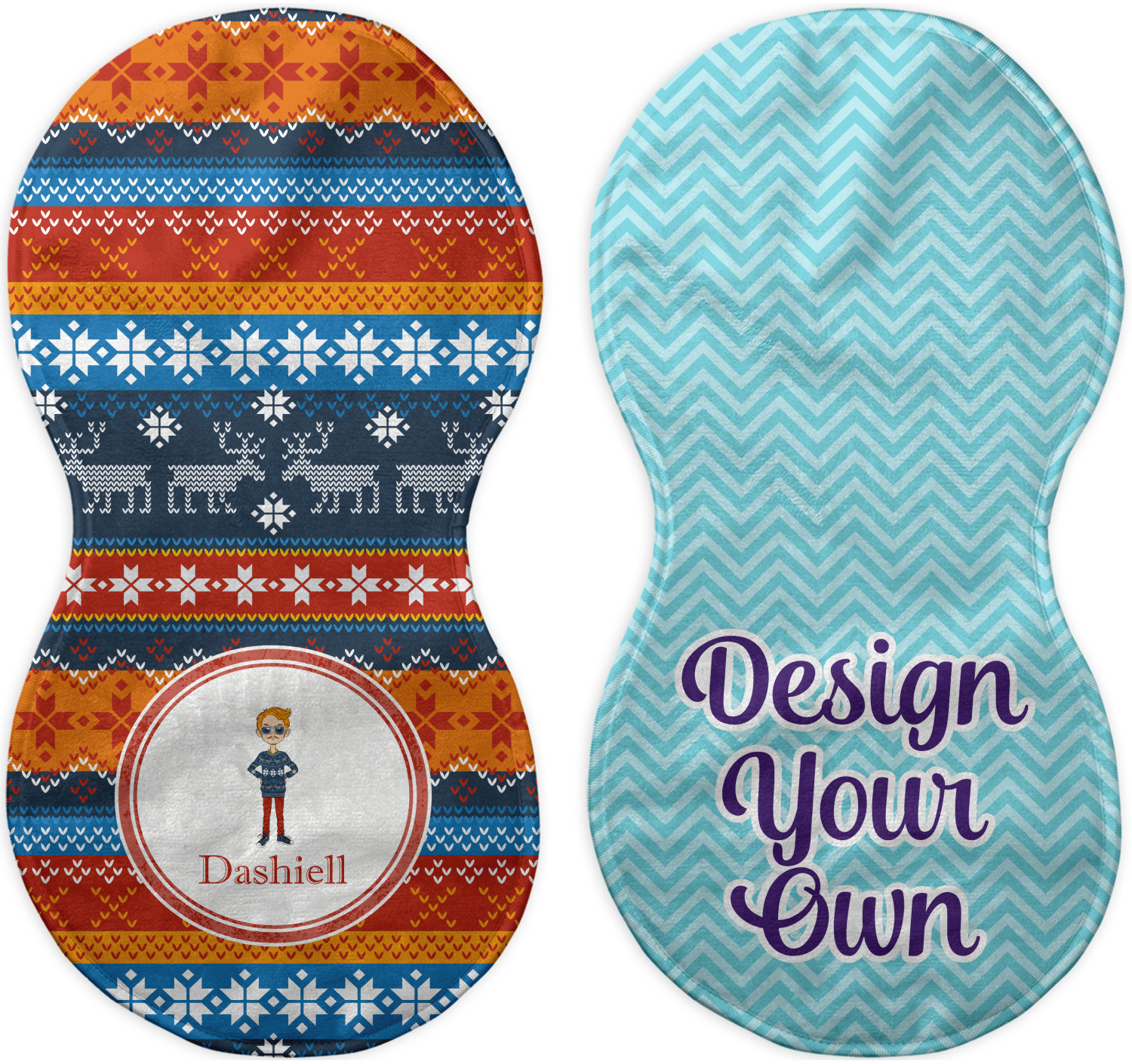 Choose your baby burp cloth from our two styles - Fleece (rectangular) or Microfiber Velour (peanut shape). The lightweight and absorbent design makes each burp cloth multipurpose; use them as a burp pad, a lap pad, a changing table, or a spare cloth to clean up any baby mess. Your customization is displayed across the front with baby-safe ink to ensure extra comfort with a white backing.