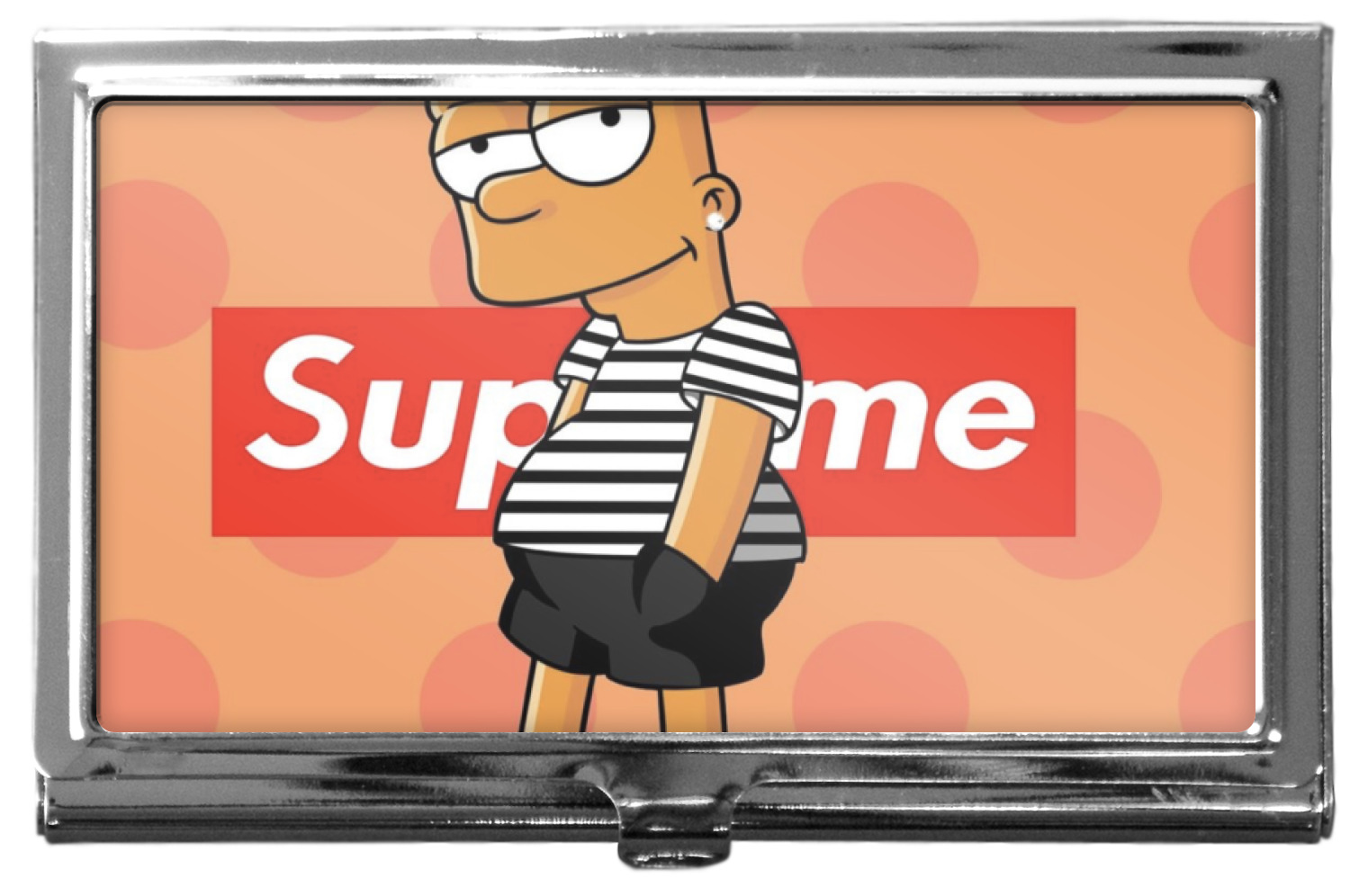 Our personalized business card holders are built from a robust, stainless steel and shaped into a sleek rectangle. At 3.75" x 2.5", and 0.25" thick, this nifty accessory holds up to 12 to 15 business cards, depending on the thickness of the cards themselves. Regardless, the skinny style makes it the perfect fit for your purse or pocket. The lid of your custom business card holder features a protruding tab to open and close your holder with a snap. To protect the mint condition of your cards, the interior of this metal business card holder is lined with a soft, felt fabric. We print your personalized design across the face of the lid.