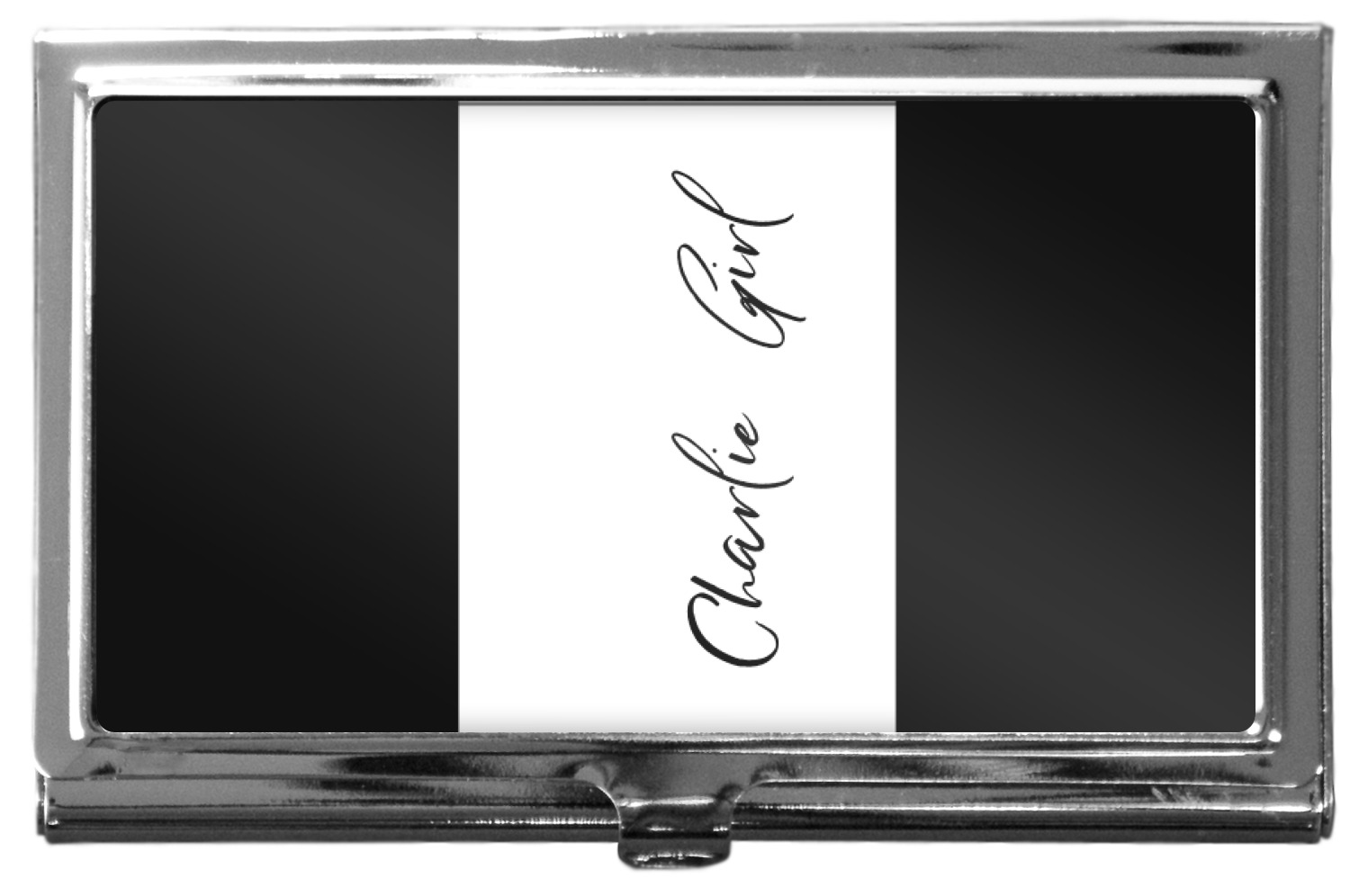 Our personalized business card holders are built from a robust, stainless steel and shaped into a sleek rectangle. At 3.75" x 2.5", and 0.25" thick, this nifty accessory holds up to 12 to 15 business cards, depending on the thickness of the cards themselves. Regardless, the skinny style makes it the perfect fit for your purse or pocket. The lid of your custom business card holder features a protruding tab to open and close your holder with a snap. To protect the mint condition of your cards, the interior of this metal business card holder is lined with a soft, felt fabric. We print your personalized design across the face of the lid.