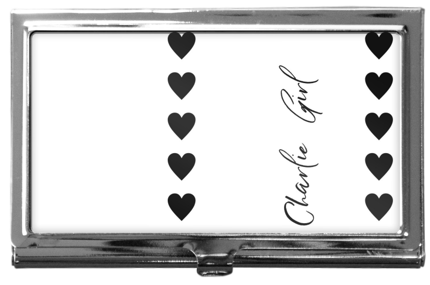 Our personalized business card holders are built from a robust, stainless steel and shaped into a sleek rectangle. At 3.75" x 2.5", and 0.25" thick, this nifty accessory holds up to 12 to 15 business cards, depending on the thickness of the cards themselves. Regardless, the skinny style makes it the perfect fit for your purse or pocket. The lid of your custom business card holder features a protruding tab to open and close your holder with a snap. To protect the mint condition of your cards, the interior of this metal business card holder is lined with a soft, felt fabric. We print your personalized design across the face of the lid.