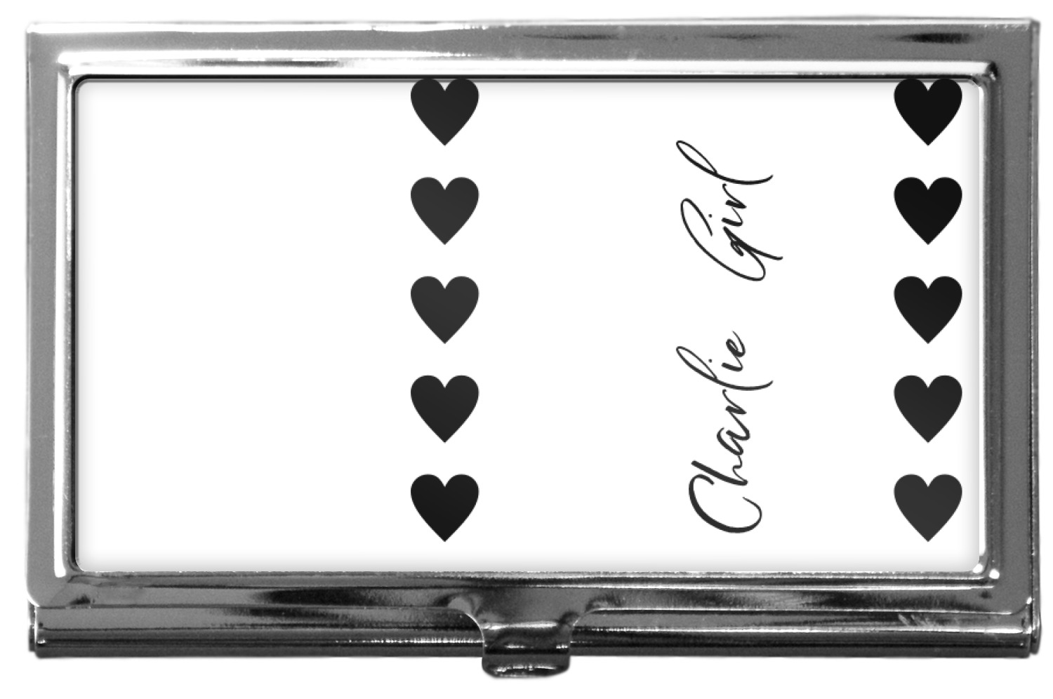 Our personalized business card holders are built from a robust, stainless steel and shaped into a sleek rectangle. At 3.75" x 2.5", and 0.25" thick, this nifty accessory holds up to 12 to 15 business cards, depending on the thickness of the cards themselves. Regardless, the skinny style makes it the perfect fit for your purse or pocket. The lid of your custom business card holder features a protruding tab to open and close your holder with a snap. To protect the mint condition of your cards, the interior of this metal business card holder is lined with a soft, felt fabric. We print your personalized design across the face of the lid.
