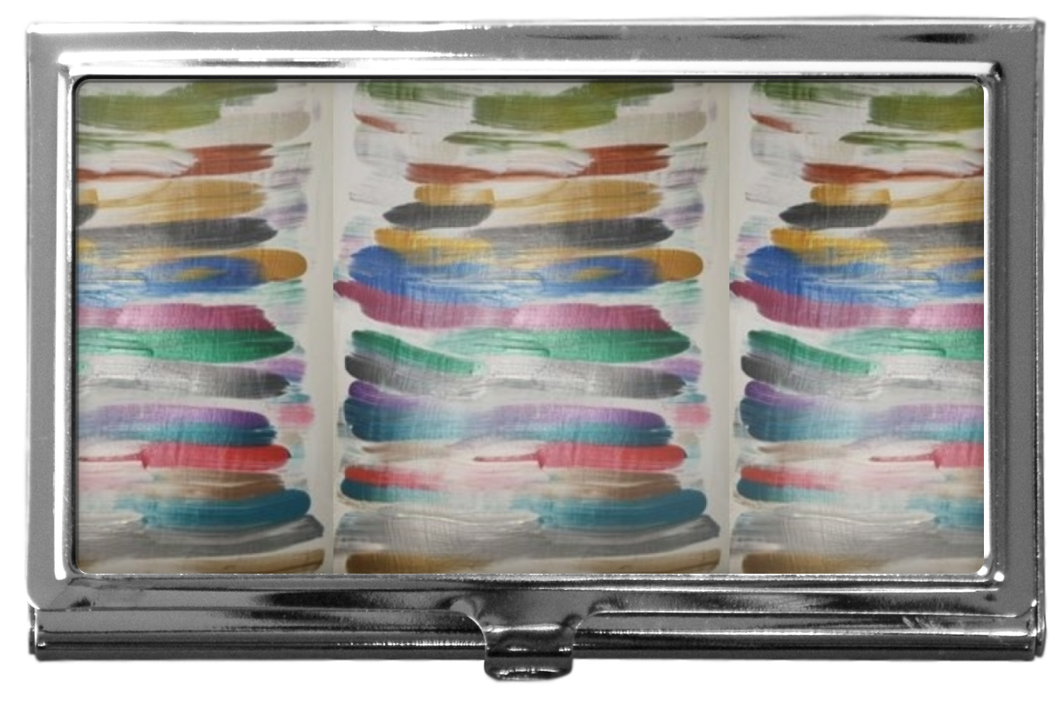 Our personalized business card holders are built from a robust, stainless steel and shaped into a sleek rectangle. At 3.75" x 2.5", and 0.25" thick, this nifty accessory holds up to 12 to 15 business cards, depending on the thickness of the cards themselves. Regardless, the skinny style makes it the perfect fit for your purse or pocket. The lid of your custom business card holder features a protruding tab to open and close your holder with a snap. To protect the mint condition of your cards, the interior of this metal business card holder is lined with a soft, felt fabric. We print your personalized design across the face of the lid.