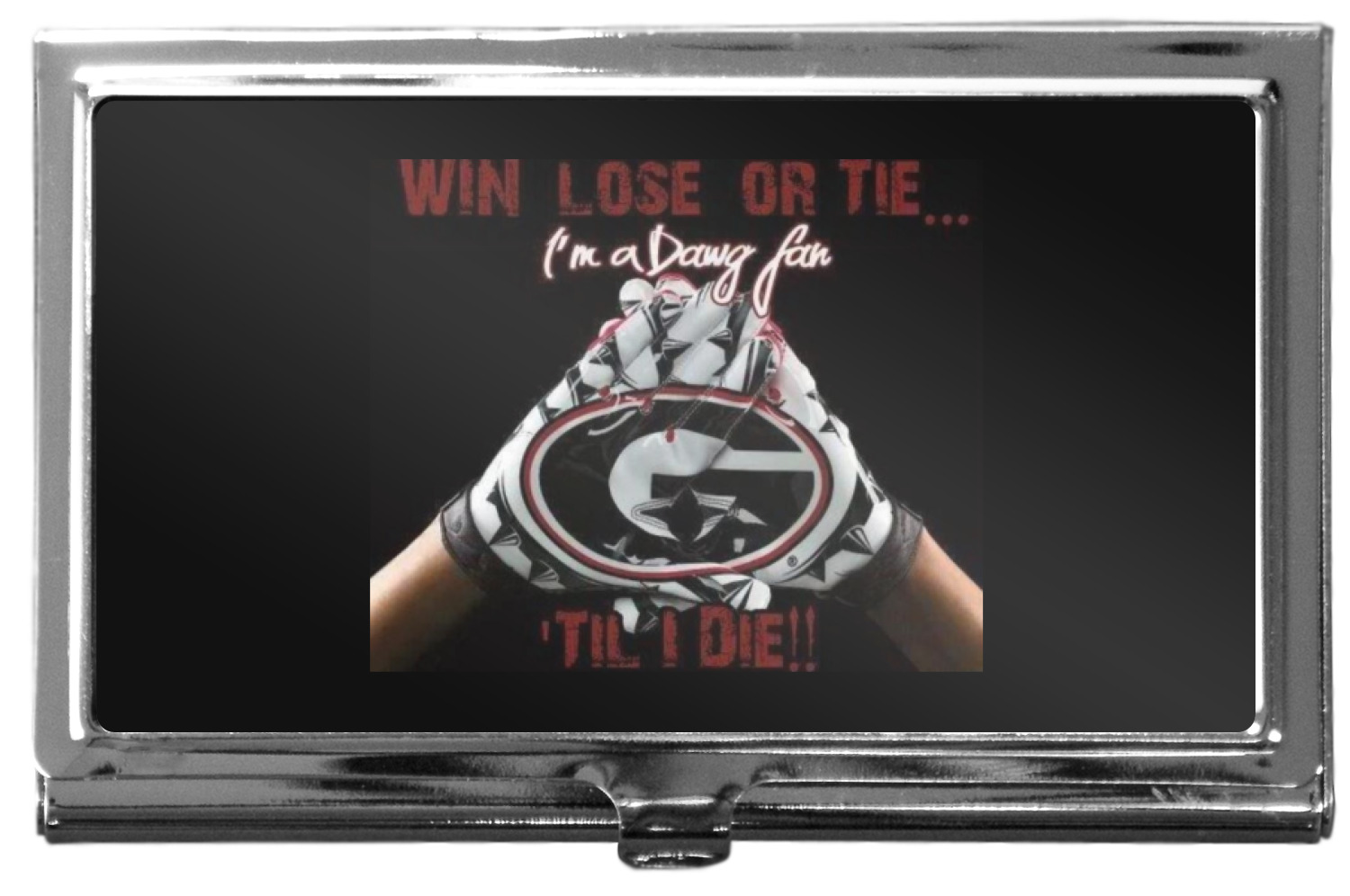 Our personalized business card holders are built from a robust, stainless steel and shaped into a sleek rectangle. At 3.75" x 2.5", and 0.25" thick, this nifty accessory holds up to 12 to 15 business cards, depending on the thickness of the cards themselves. Regardless, the skinny style makes it the perfect fit for your purse or pocket. The lid of your custom business card holder features a protruding tab to open and close your holder with a snap. To protect the mint condition of your cards, the interior of this metal business card holder is lined with a soft, felt fabric. We print your personalized design across the face of the lid.