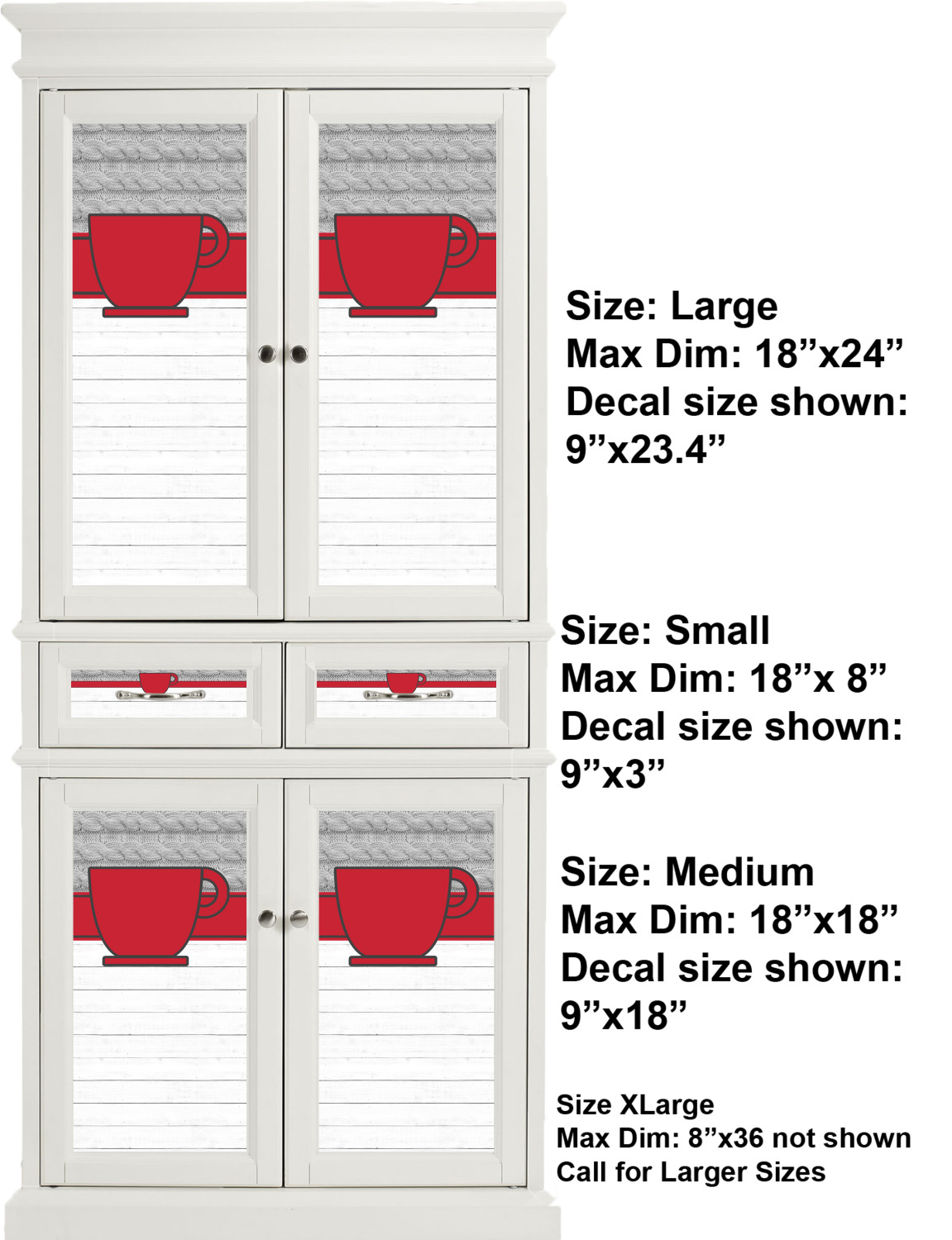 We print your customized design in full color, onto a high quality vinyl, covered with a glossy finish. For attachment to the cabinet, each cabinet sticker is accompanied by an easily applied, adhesive backing. The adhesive backing also guarantees a smooth removal or repositioning if desired. We sell these decals in four different sizes, but each size can be downsized appropriately to fit the needs of your kitchen. We offer a small, which is 18 by 8 inches, a medium, which is 18 by 18 inches, a large, at 24 by 18 inches, and an extra large, at 36 by 18 inches. We advise that you measure your cabinets first so you can make a properly informed purchase. For those who are interested in purchasing decals larger than 18 by 36 inches, please contact our team.